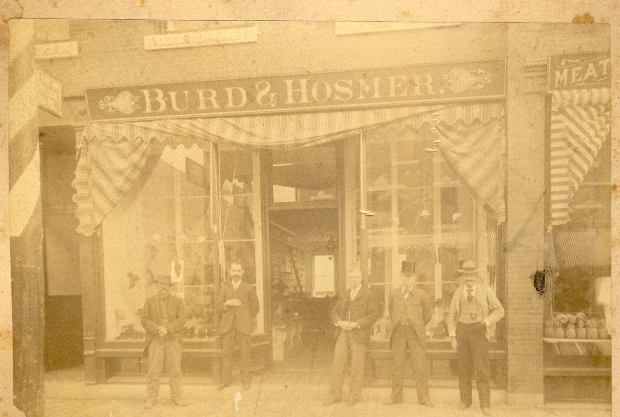 exterior shot of storefront of the Burd and Hosmer store on Main St. It was a boot and shoe store. Five men are standing outside but are not identified. It is assumed that one is George Burd, co-owner.Collection