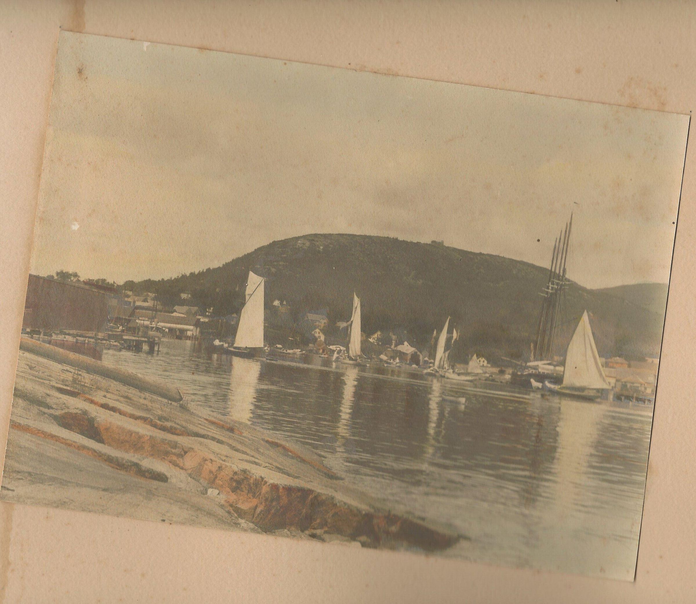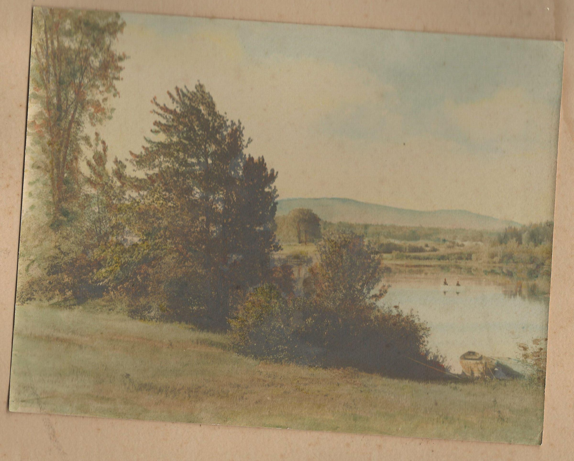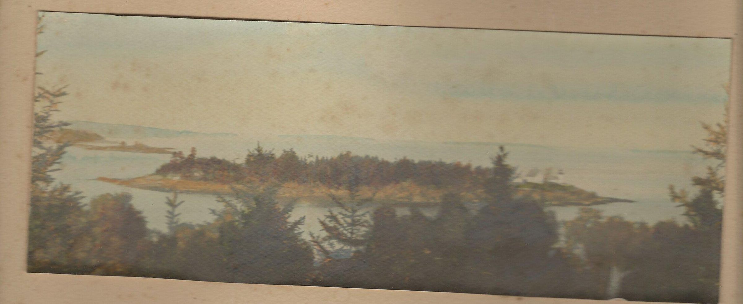 7 hand colored photos of Camden and Owls Head Maine mounted on piece of poster board