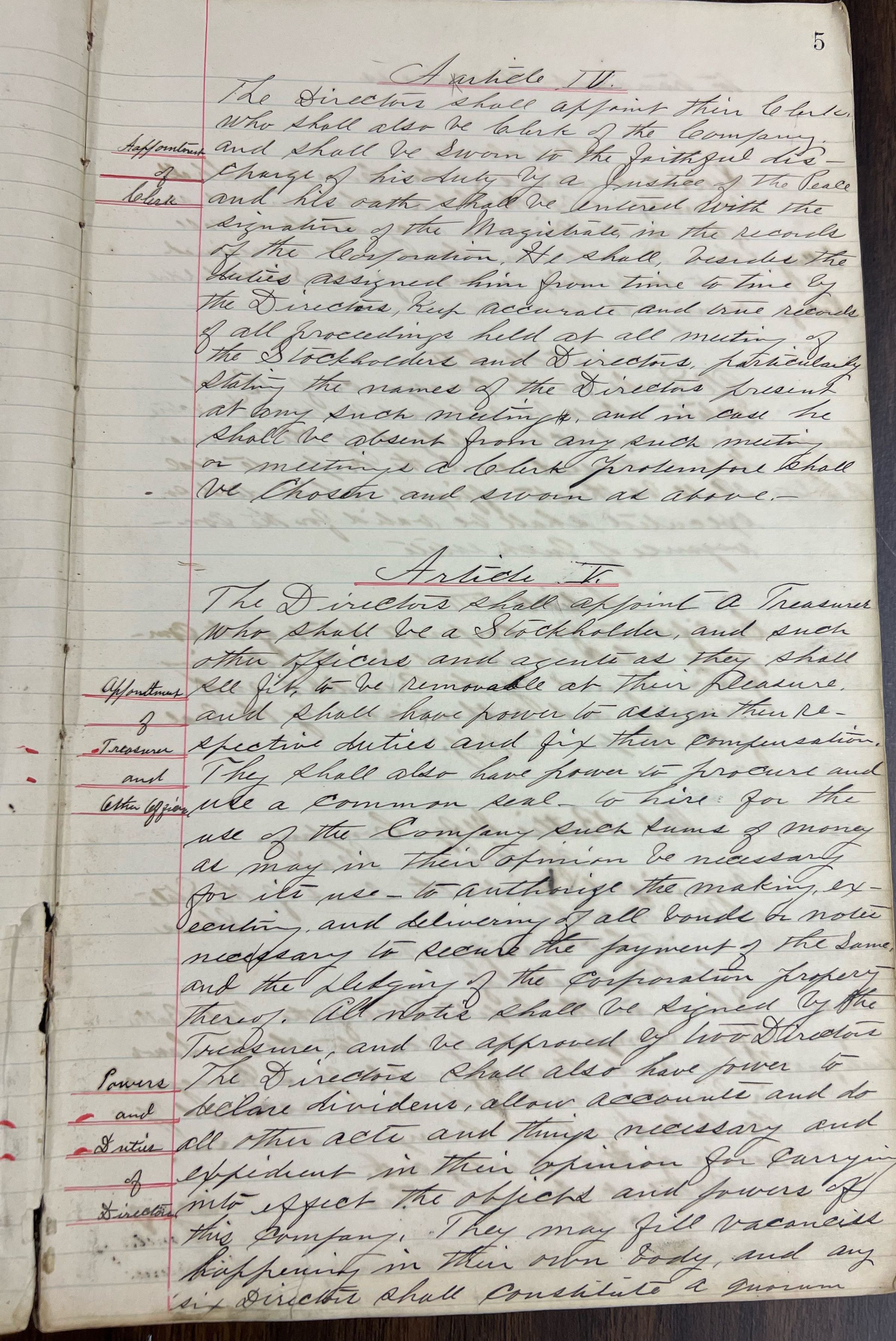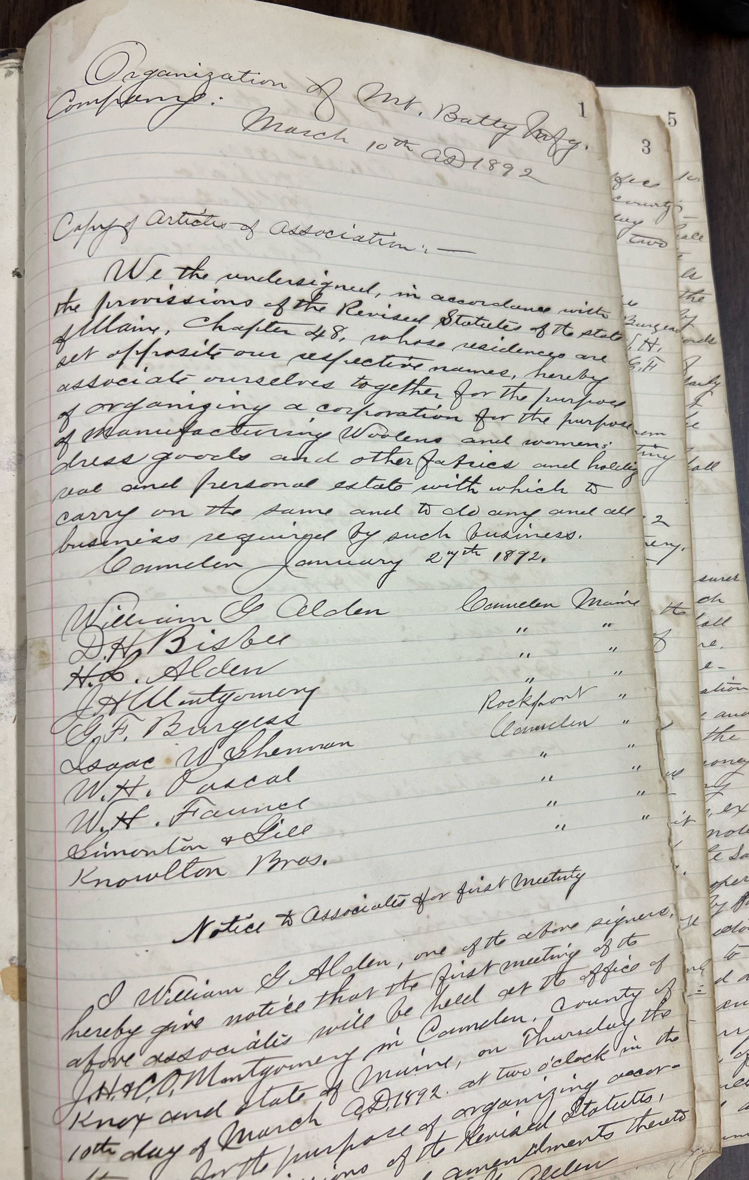 Mt Battie Manufacturing Co Record book of Organization 1892