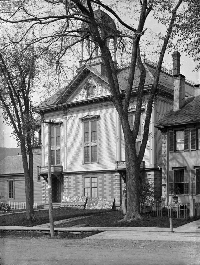 glass negative of Megunticook Hall on Elm St. in Camden. It was a wooden structure built in 1877. There was a large public hall with a stage and galleries plus smaller halls. After the fire of 1892, it was replaced by the brick Camden Opera House.Collection