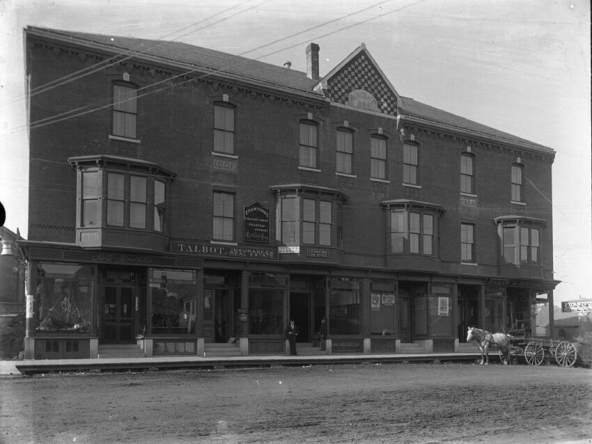 Glass plate negative image of the Adams Block on Main St., Camden. Storefronts and signs indicate the following businesses and organizations: Talbot Insurance, Crawford Law Firm, Shaw and Rittenbush, Rose Brothers and Odd Fellows Hall. Built after the Fire of 1892.Collection