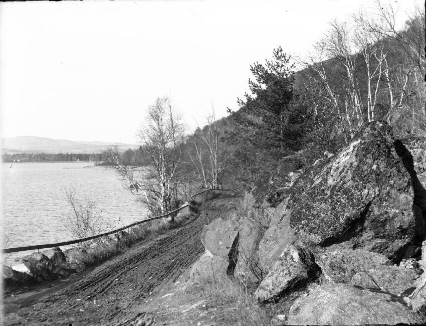 glass negative of photo of the Turnpike next to Megunticook Lake. The turnpike is a narrow dirt road in this photo with a wooden rail fence on the lake side.Collection