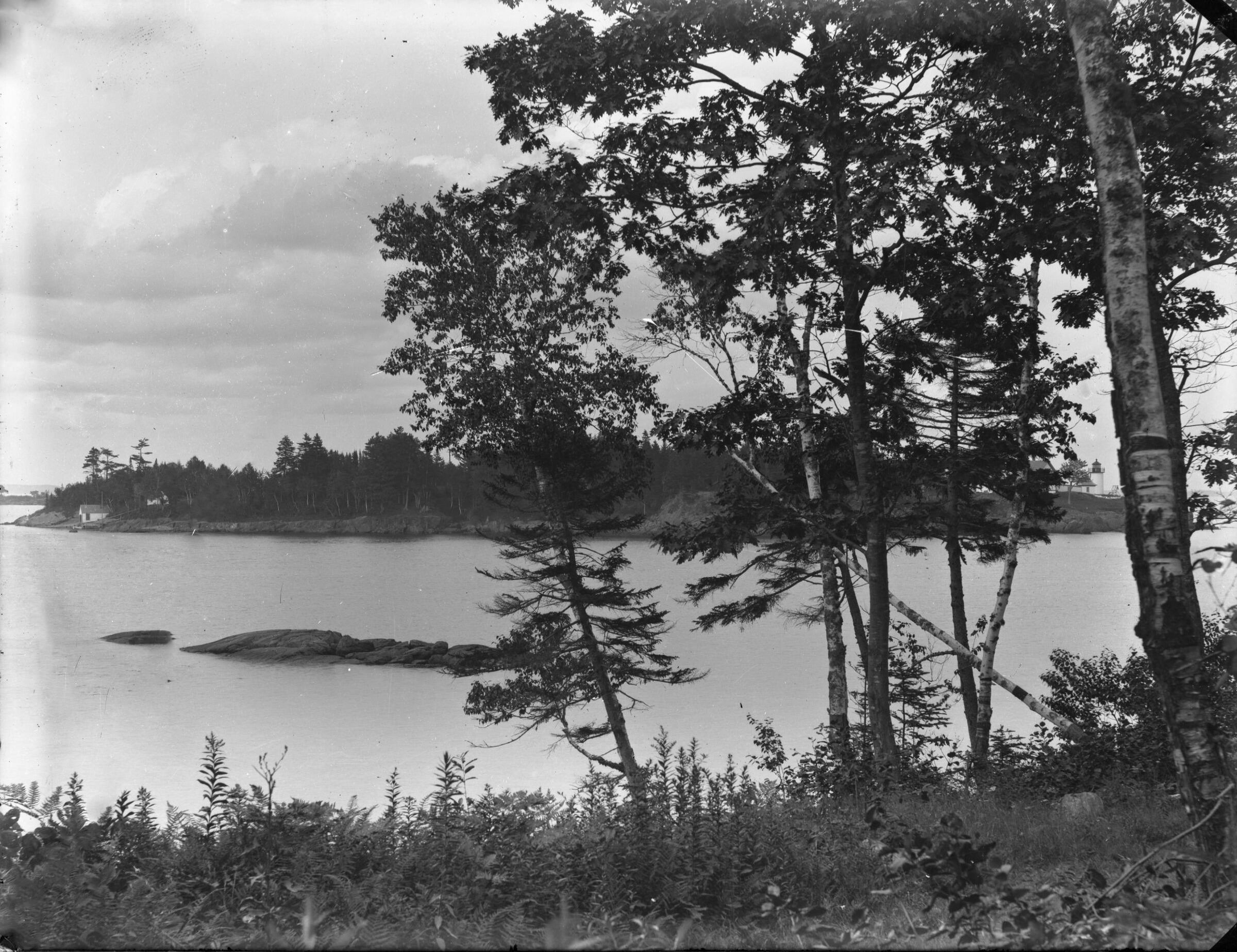Glass negative image of Curtis Island in Camden Harbor. Photo is taken from Bayview Street. Image shows the boathouse on north side of island. The lighthouse is visible through the trees to the right. The island was called Negro Island until the 1930s.Photograph Details