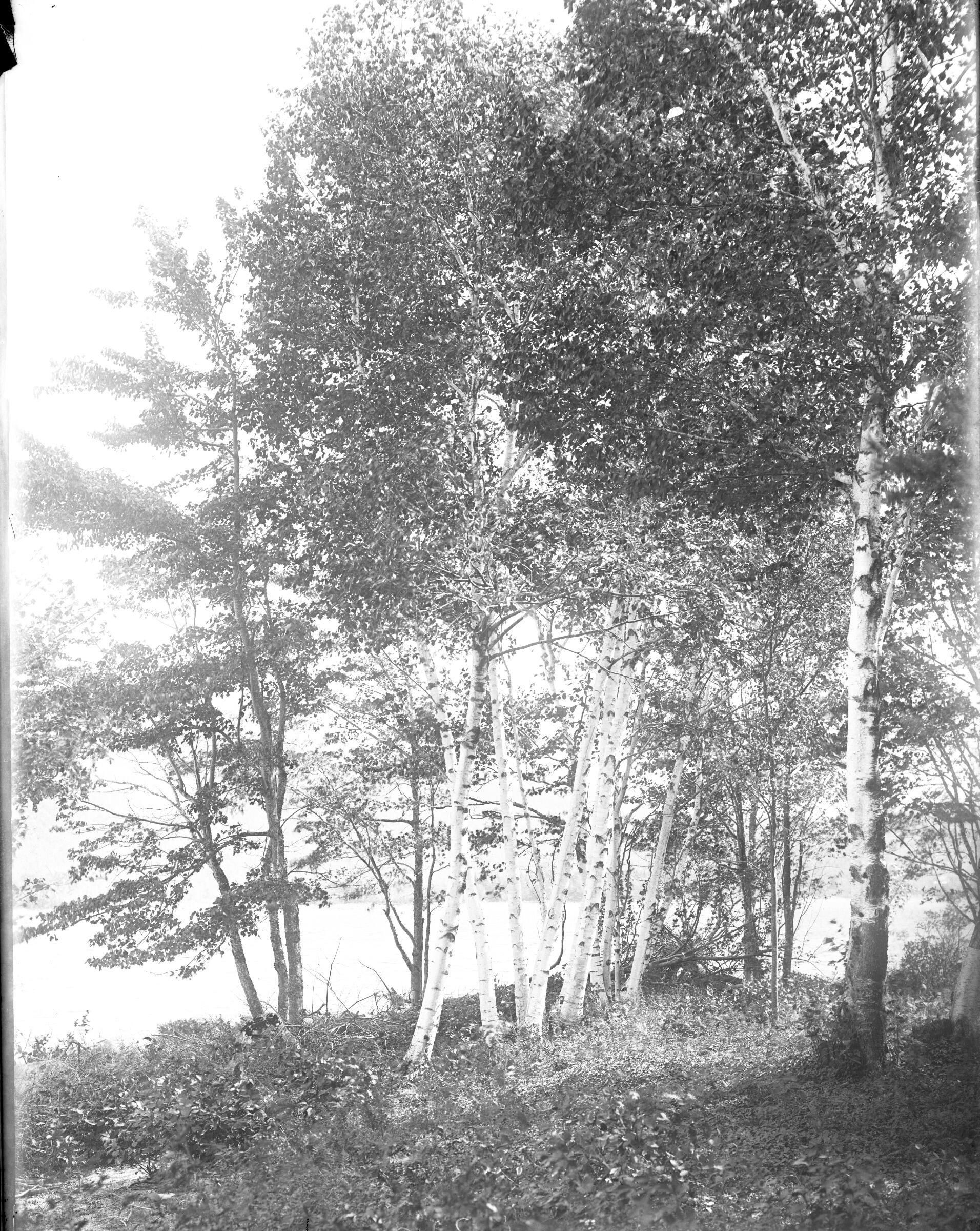 glass negative of photo of a clump of birch trees. Through the trees there is a body of water and perhaps an island in the far backgroundCollection