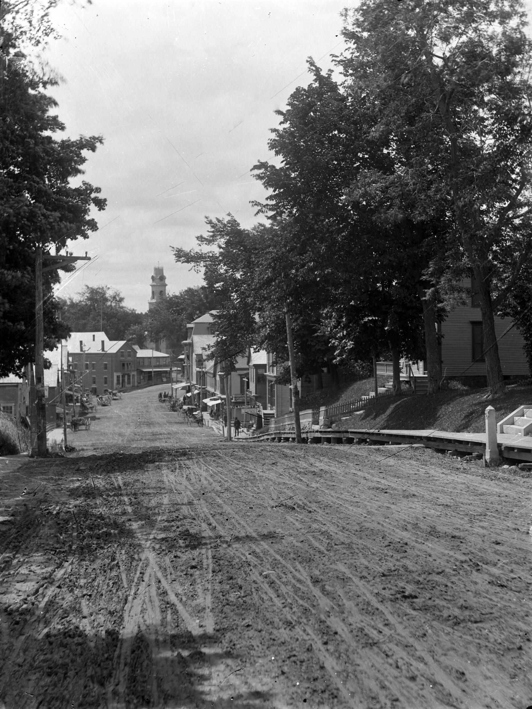 glass negative of view into downtown Camden from "Harbor Hill" on north side of town, along Main St. (Rt. 1) Streets are not paved and wooden railings are on the edge of the streetCollection
