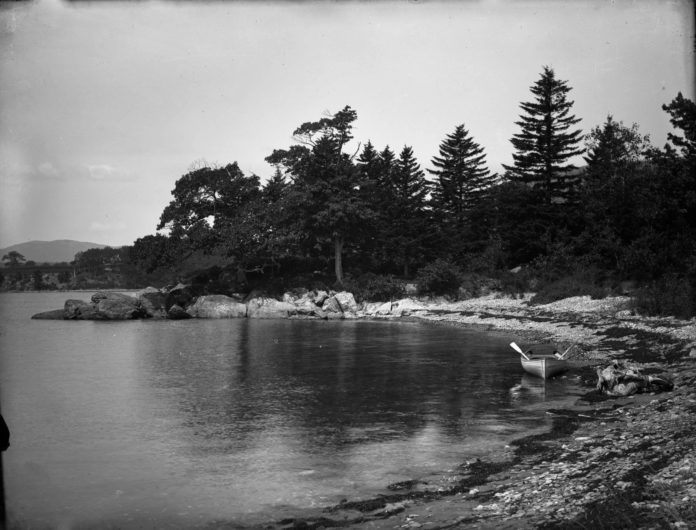 glass negative of photo of Beauchamp Point with buildings in Rockport in the distance. A rowboat is pulled up on the shoreCollection