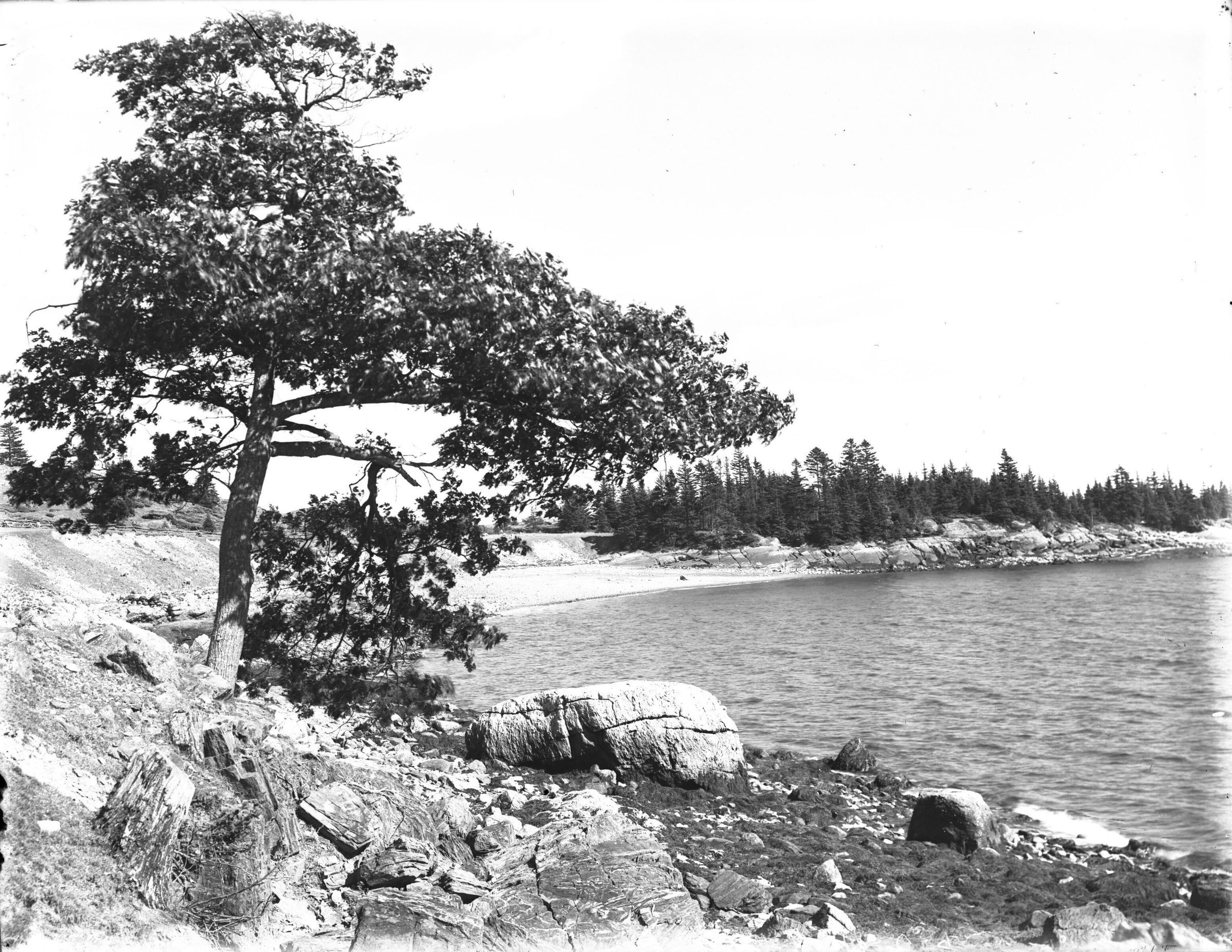 glass negative of a photo of shoreline . Prominent in the photo is a tree growing out of the ledges. photo may possibly be of Beauchamp PointCollection