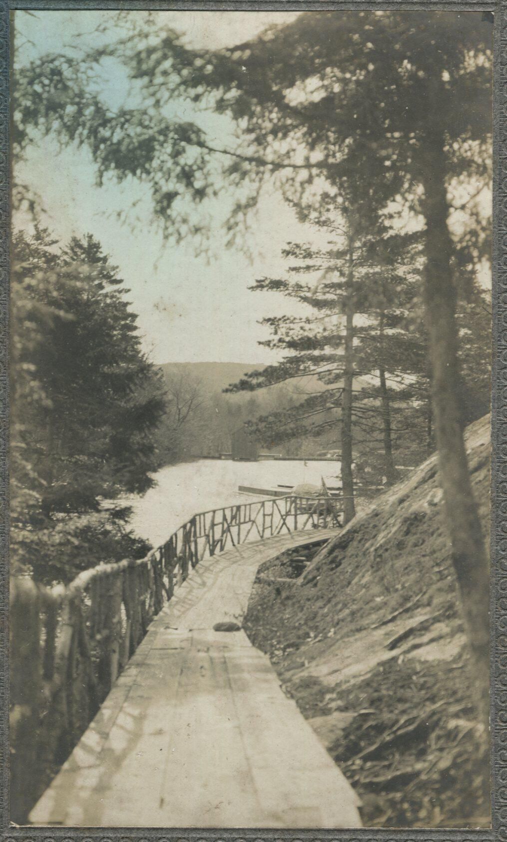photo of a wooden walkway down a hill to lake. Location unknown, possibly Rockledge near the FIsh Hatchery and Megunticook River. Photo is mounted on original card stockCollection