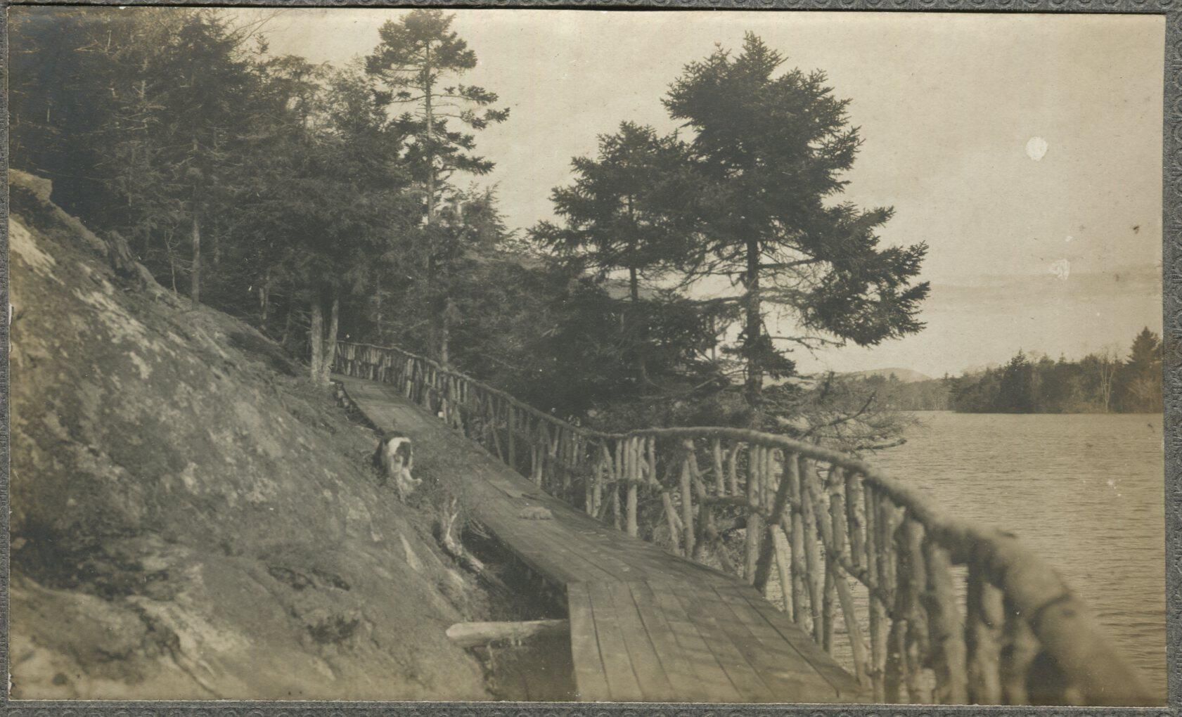 photo of wooden walkway around a hill or ledge next to a lake. Location is possibly Rockledge near the Megunticook River and the Fish Hatchery. Photo is mounted on original card stockCollection
