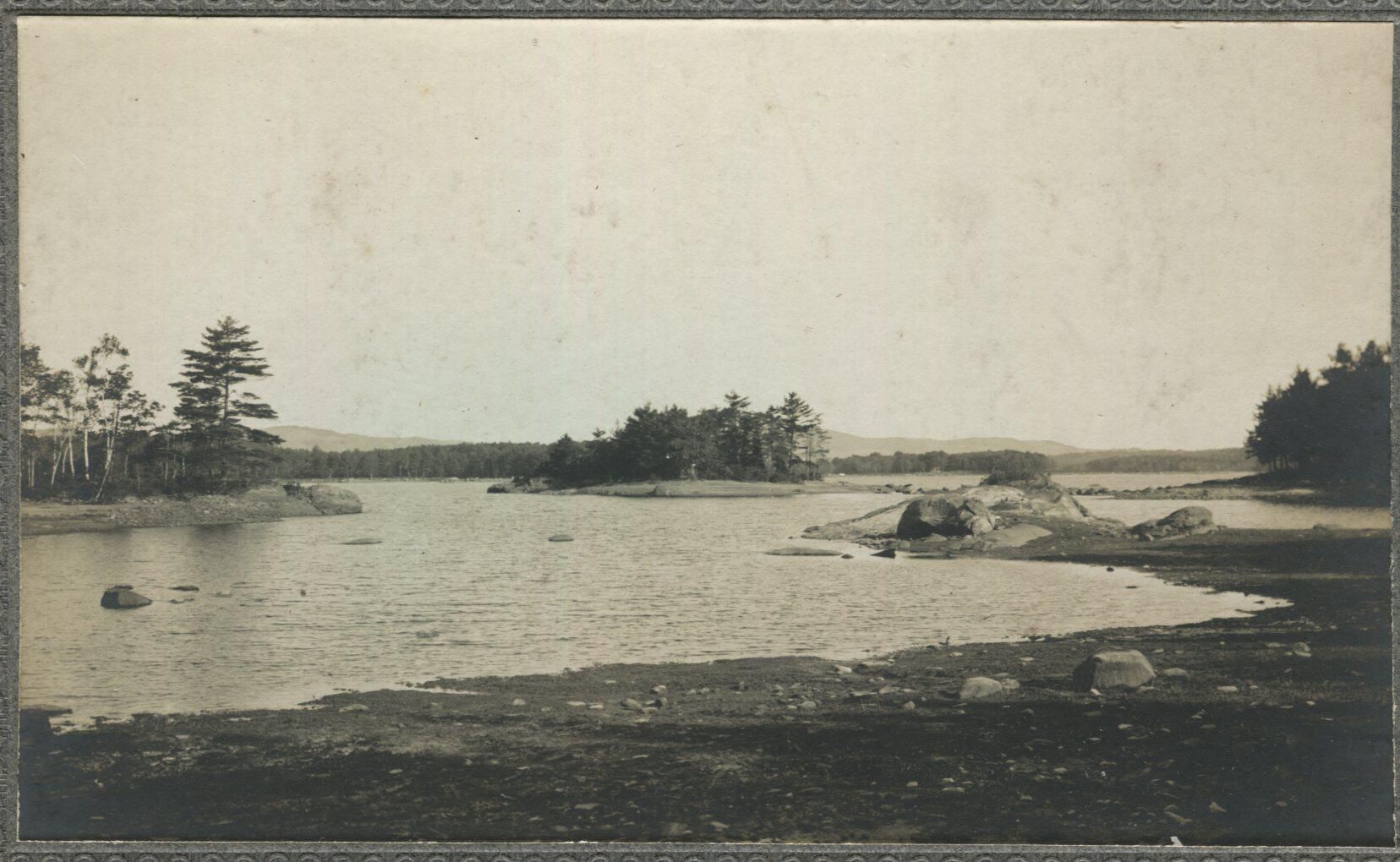 photo of shoreline and islands at Megunticook Lake (possibly). Photo is mounted on original card stockCollection