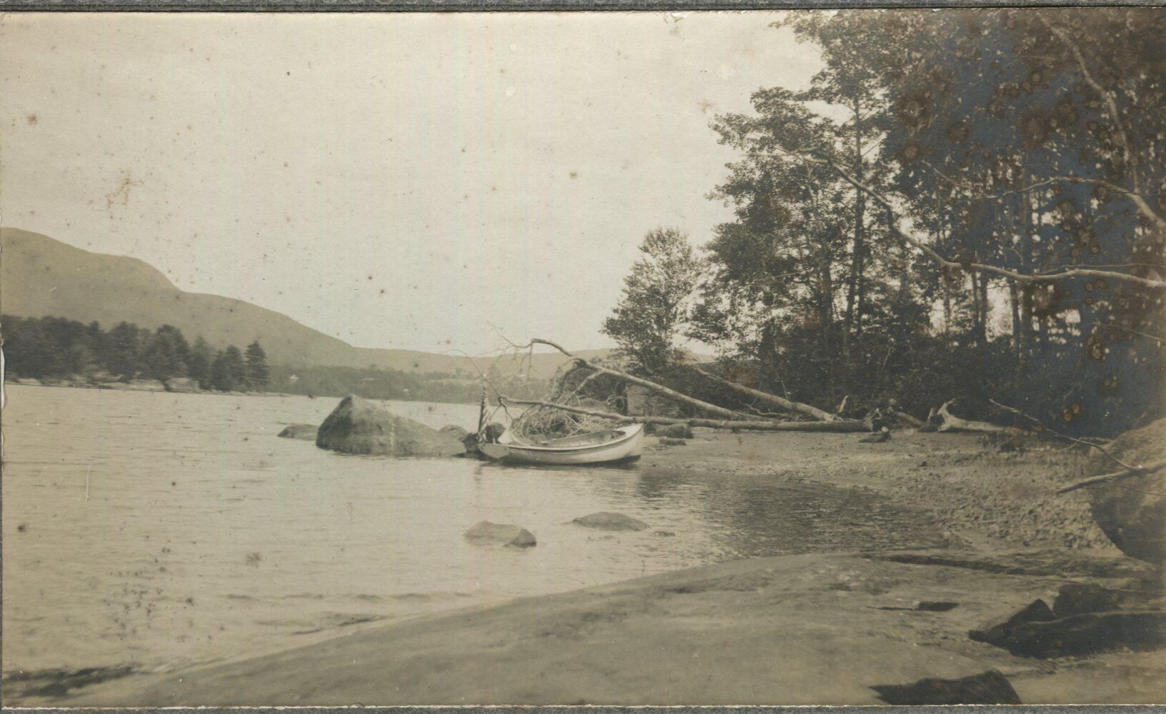 photo of beach at Megunticook Lake, boat and fallen tree in foreground, in distance is Mt. Megunticook and Maiden's Cliff. Location is likely near the Potter family lake cottage on western shore. Photo is mounted on original card stockCollection