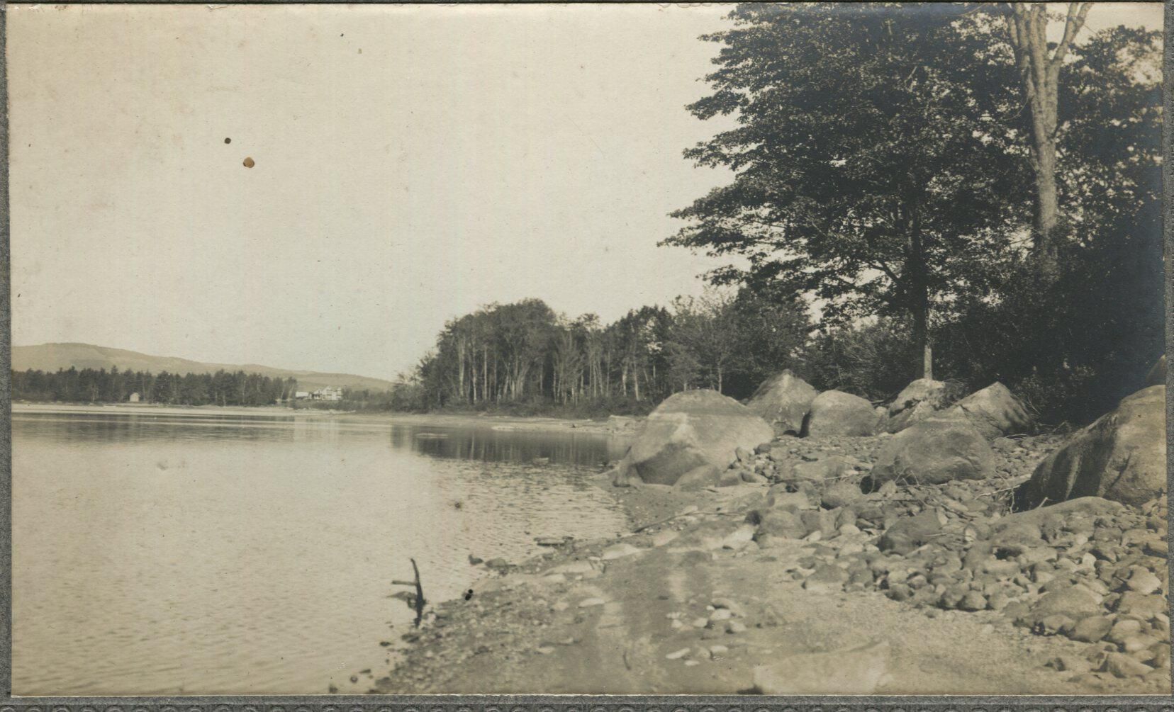 photo of the lake area, shoreline in foreground, with large farm or house in backgroundCollection