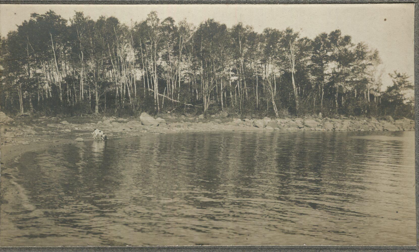 photo of a stand of birch trees along the water's edge. A dog is drinking from the water, possibly Megunticook LakeCollection