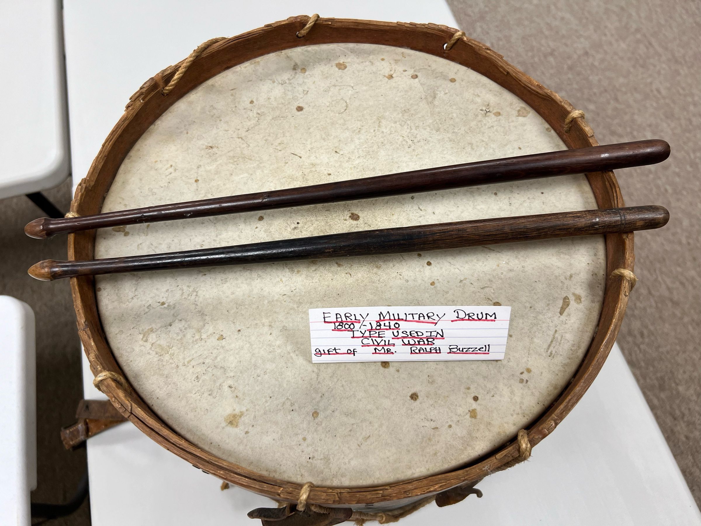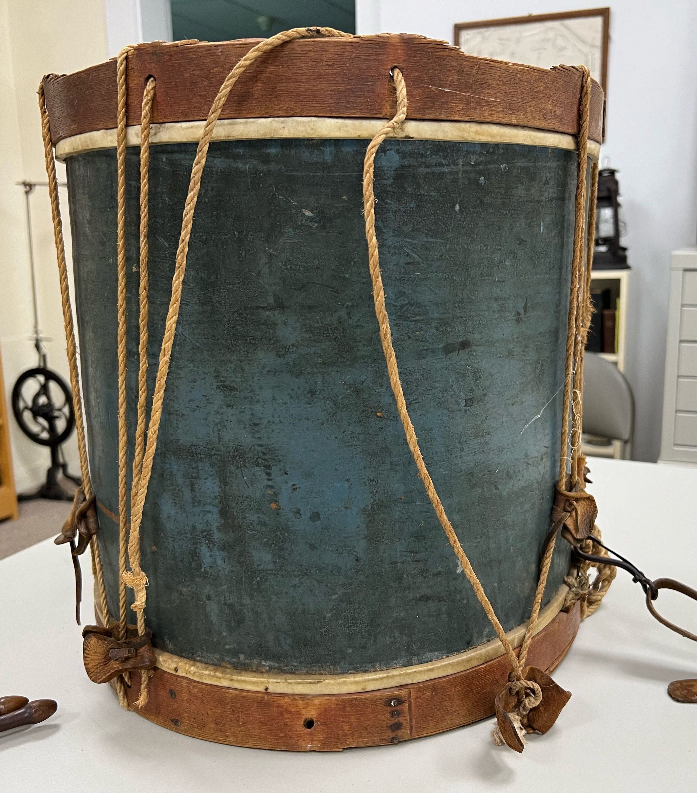 The image displays an old, cylindrical drum adorned with detailed, faded artwork featuring an eagle clutching arrows and an olive branch, surrounded by stars and a crest. The drum, bound by weathered leather and rope, exudes a vintage, historic aura, hinting at its possible use in military or ceremonial functions. The visible wear and imperfections add to its authentic, antique charm, encapsulating a sense of timelessness and enduring craftsmanship against a plain background.