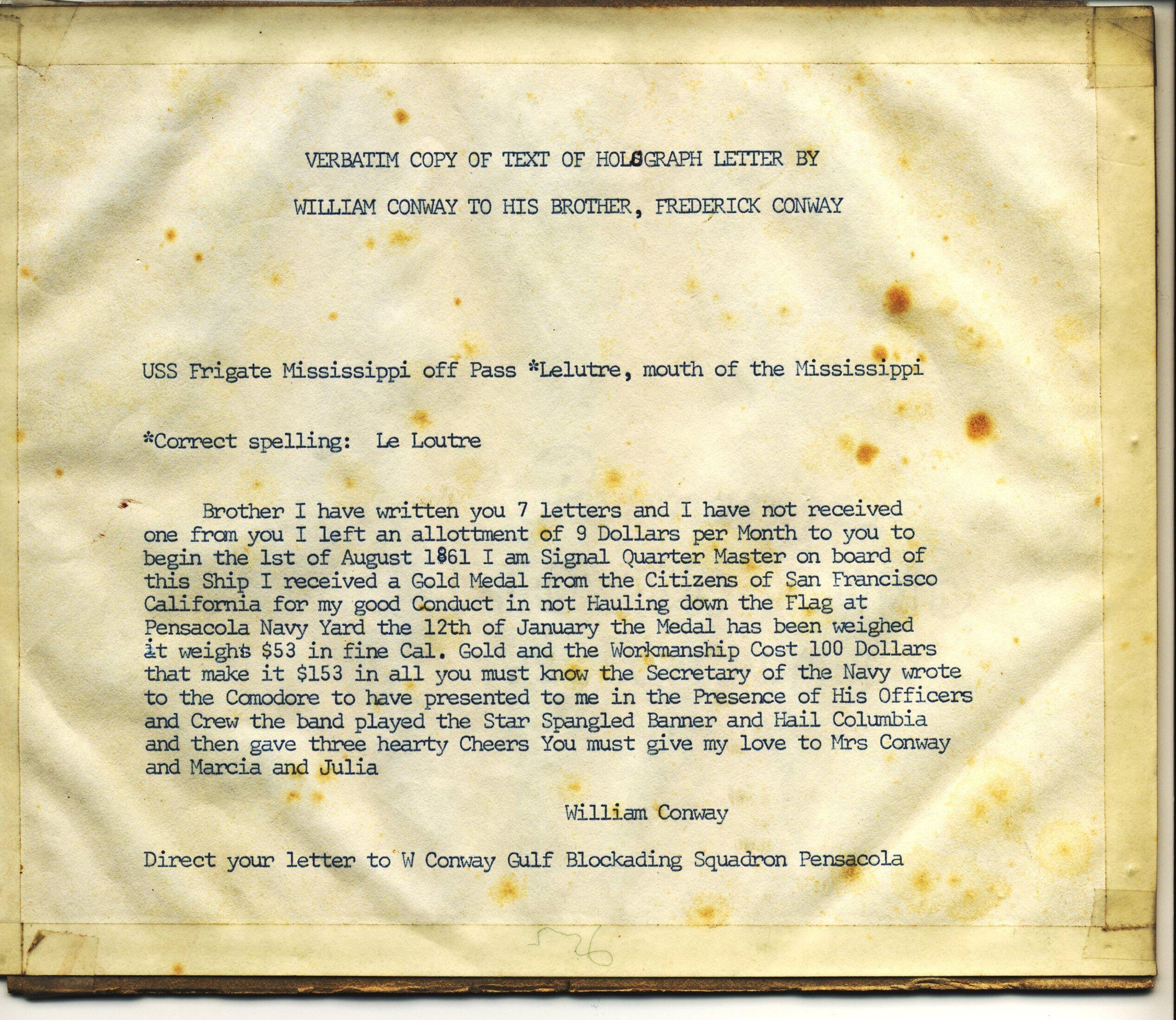 The letter was written while Conway was on the USS Frigate Mississippi off the mouth of the Mississippi River. He tells about receiving a Gold Medal from the Citizens of San Francisco, California for his conduct in not hauling down the flag at the Pensacola Navy Yard.Collection