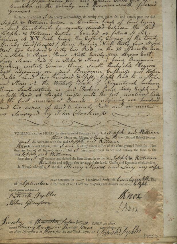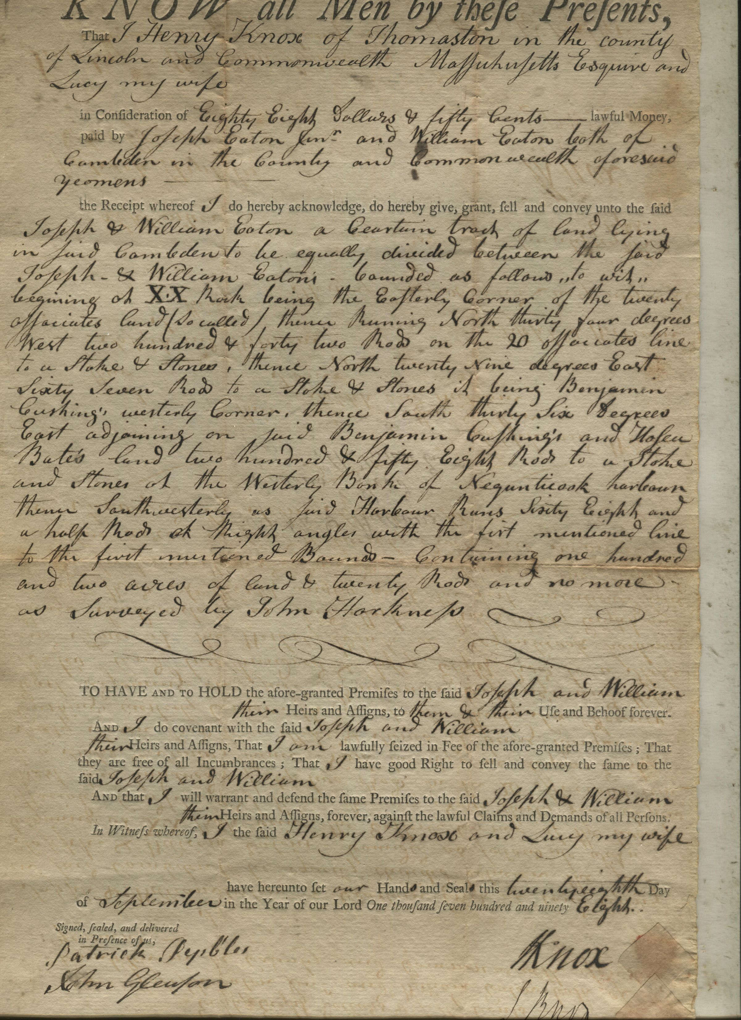 Deed between Henry and Lucy Knox of Thomaston to Joseph and William Eaton of Camden, 1798Collection