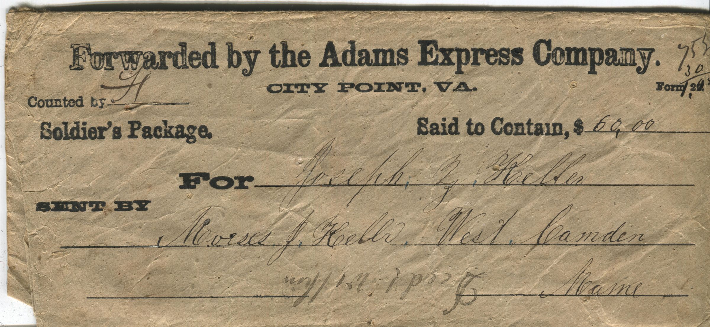 Soldier's Package Envelope Adams Express Co., City Point, VA