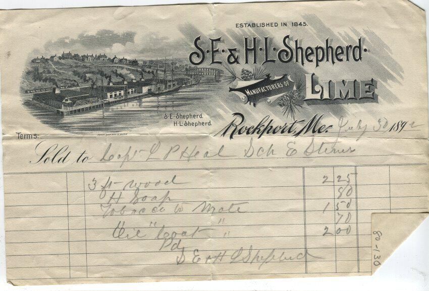 Billhead of S.E.& H.L. Shepherd Lime Manufacturers in Rockport.