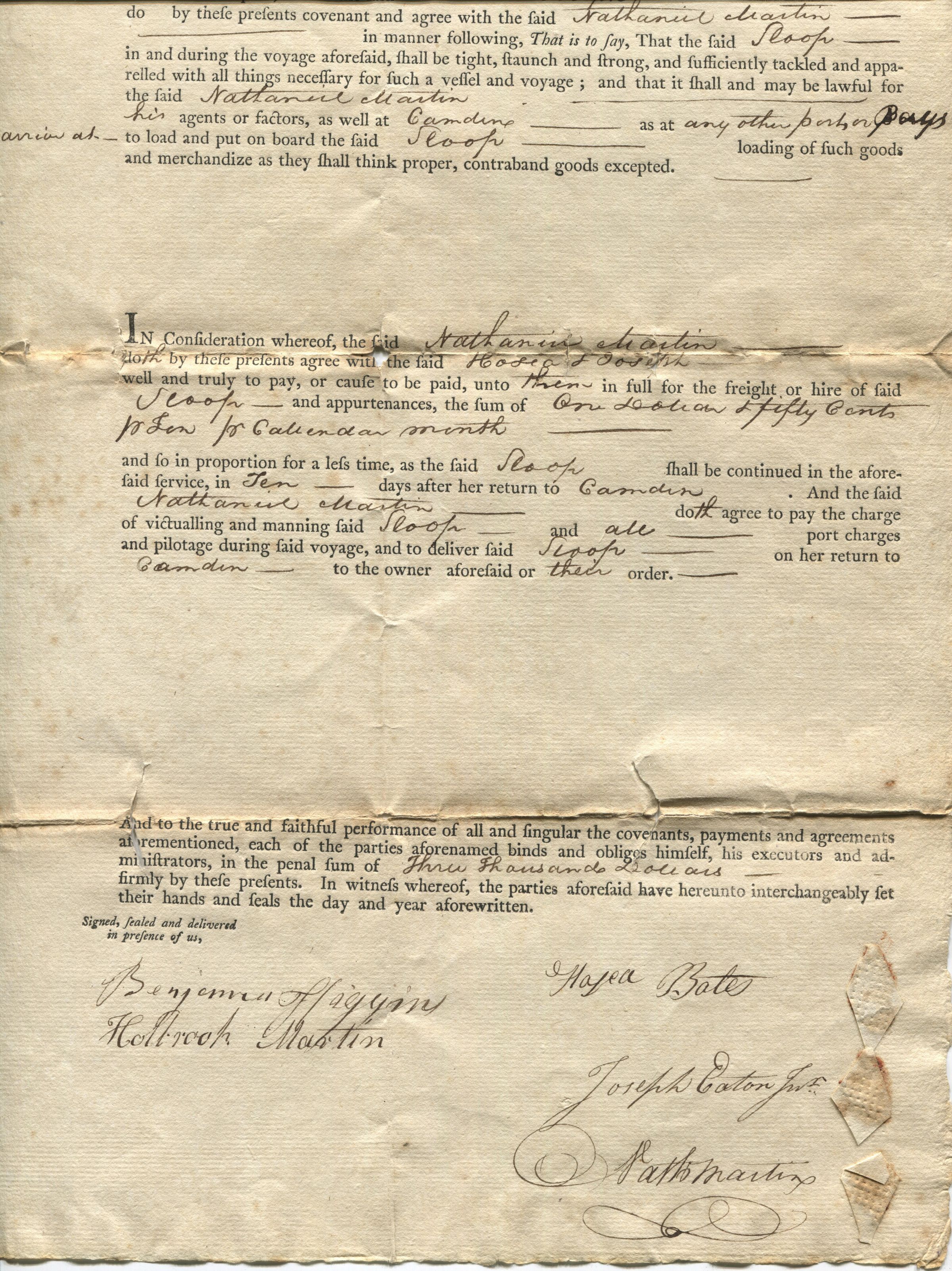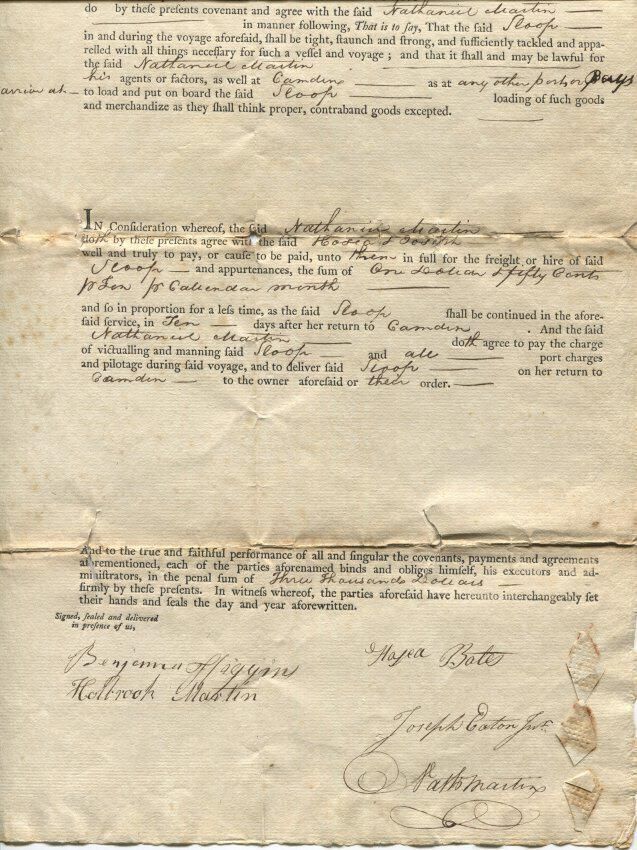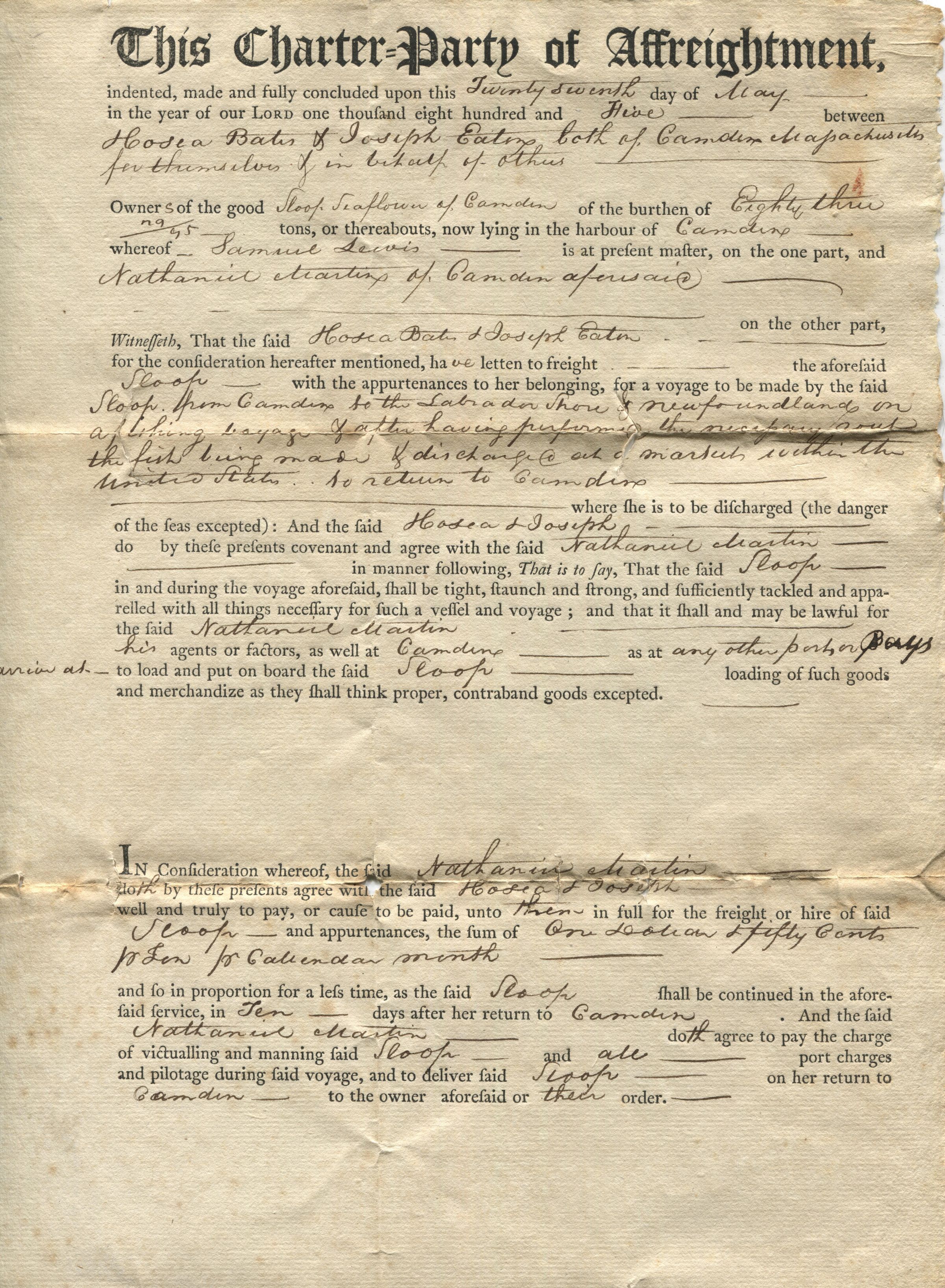Affreightment charter for the Sloop Seaflower of Camden between Nathaniel Martin, Hosea Bates, and Joseph Eaton, Jr. for a fishing trip to Newfoundland, May 1805.