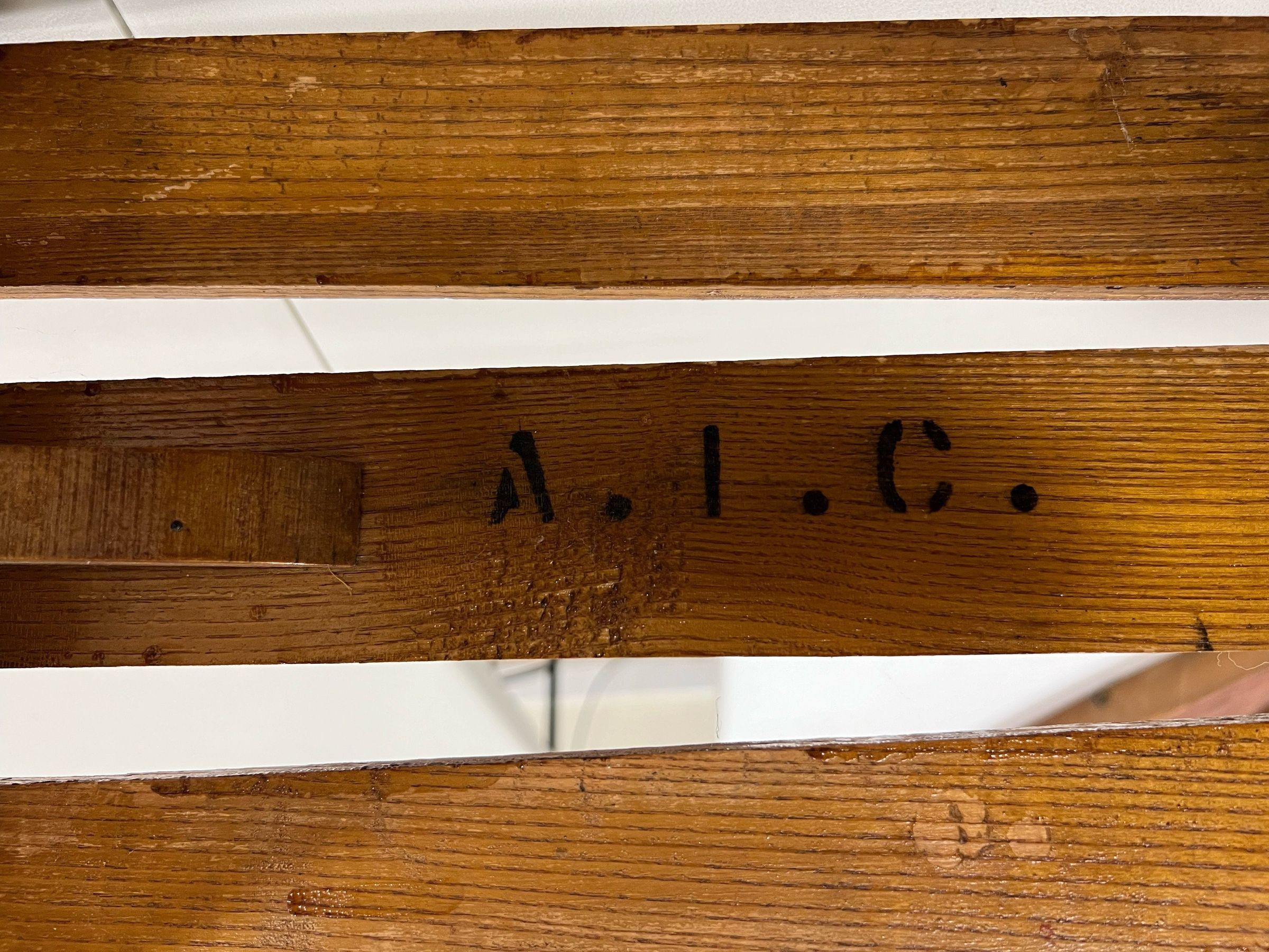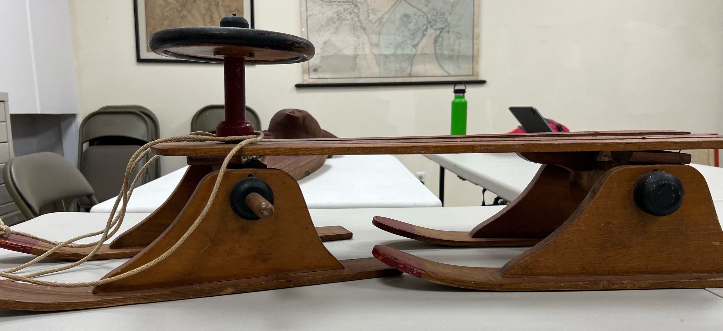 The image shows a vintage wooden sled, characterized by its robust, rustic design, featuring faded red and yellow paint on its horizontal slats. The sled is branded with the words "OLYMPIC Bob Sled," suggesting a theme or homage to Olympic bobsledding, and it includes a steering mechanism topped with a black circular grip, connected by ropes for control. The contrast of the battered wood and worn paint hints at its considerable use and adds to its antique charm, presenting a nostalgic