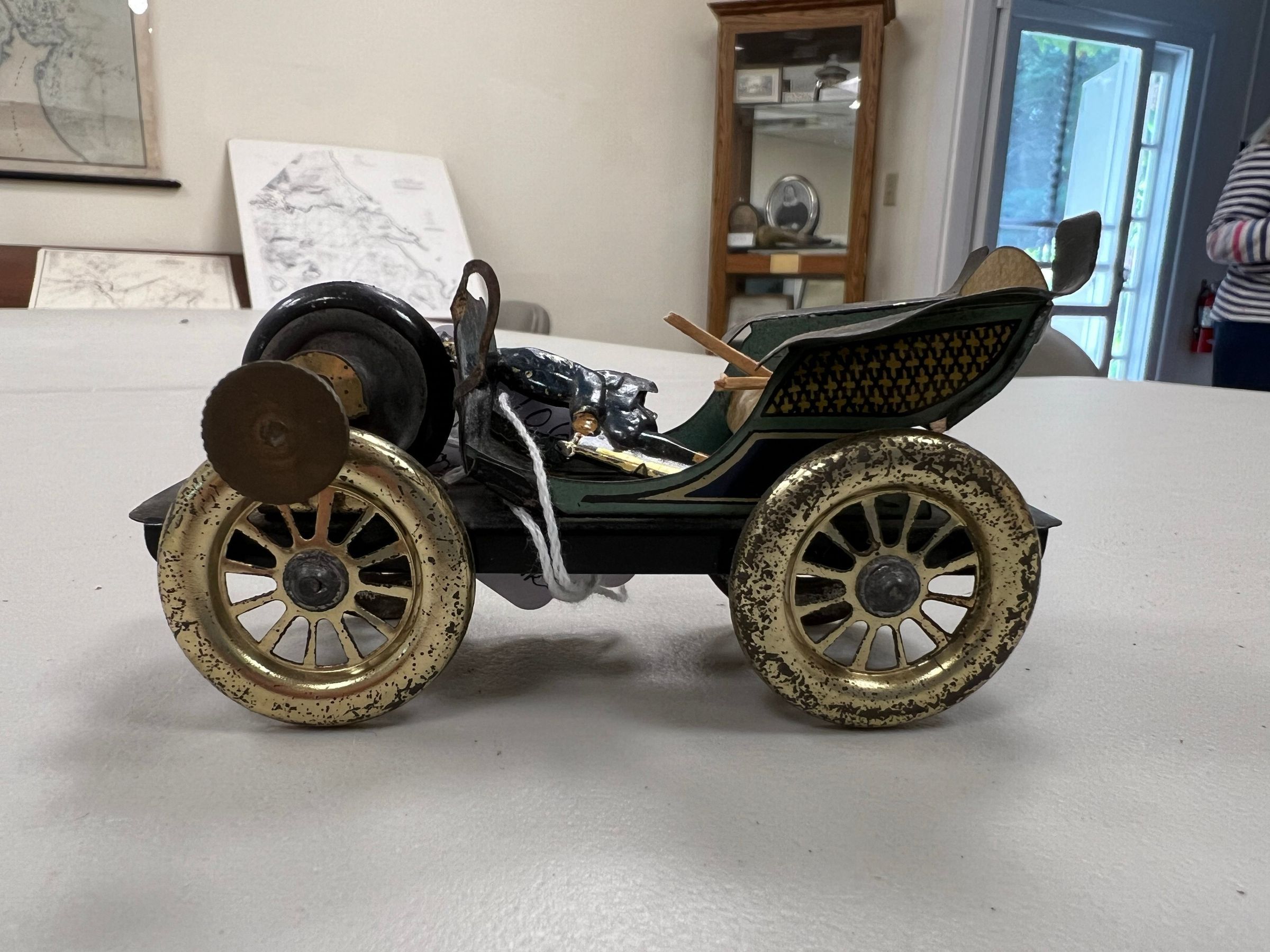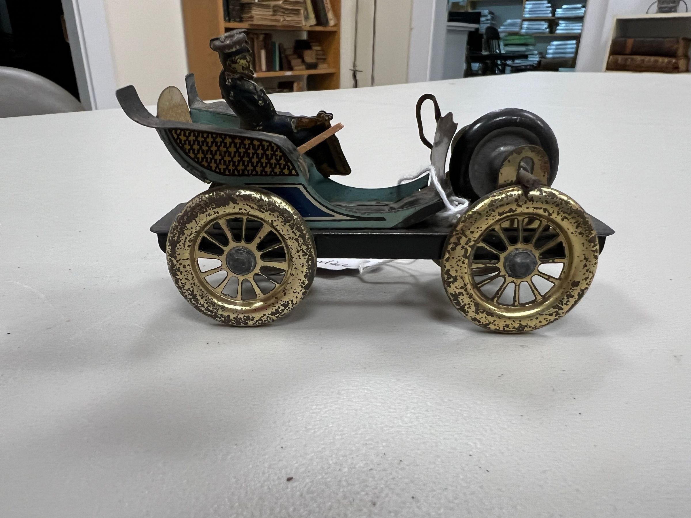 ISSMAYER FLYWHEEL AUTOMOBILE OVERSIZED PENNY TOY. Germany c. 1910. 1.75x4.25" long combination of painted tin with litho seats and driver. Heavy lead wheel in front spins to move car forward or backward. Nicely designed. Company made many penny toys. This toy is pictured in Pressland's "Book Of Penny Toys" page 43Acquisition