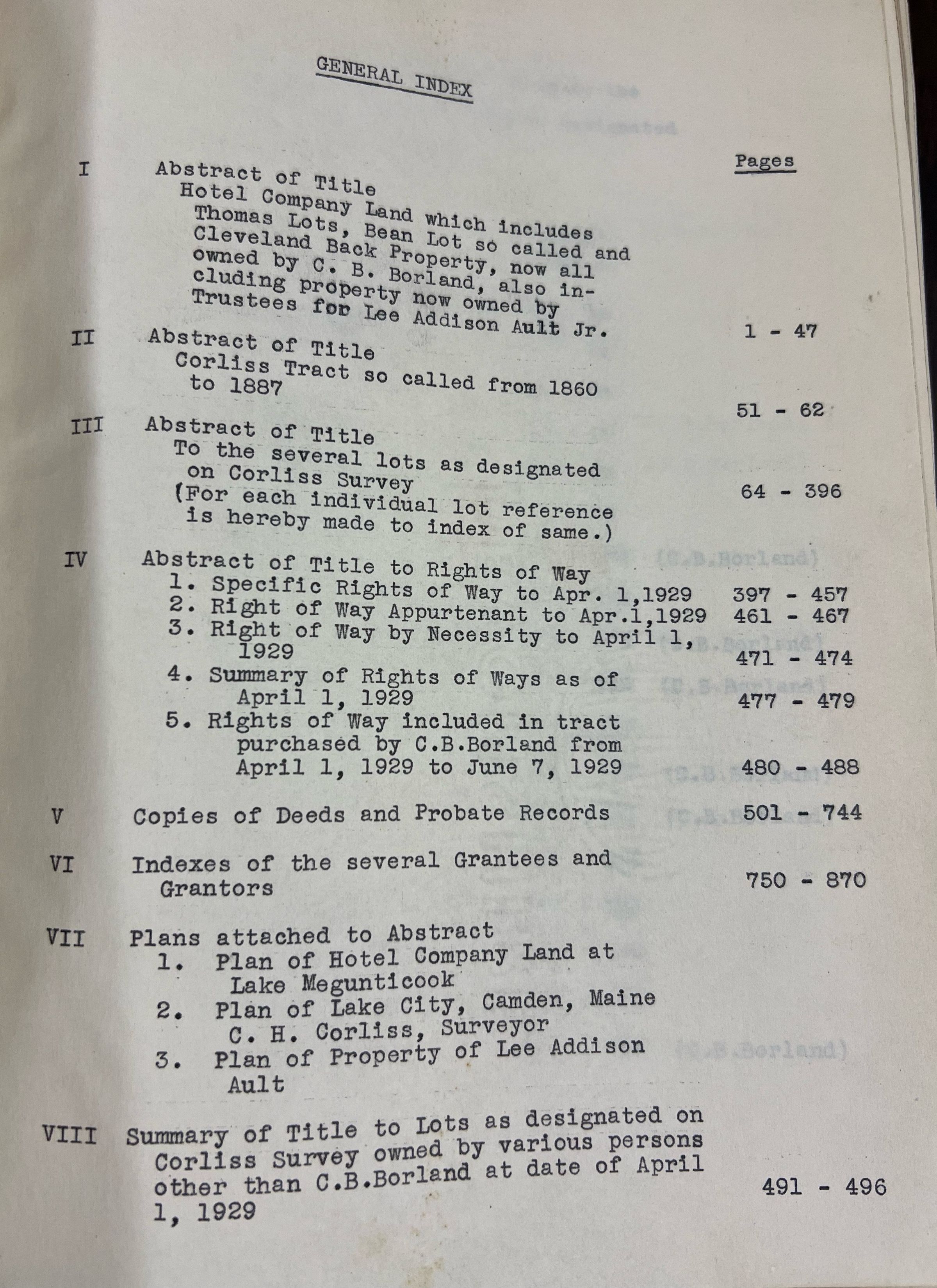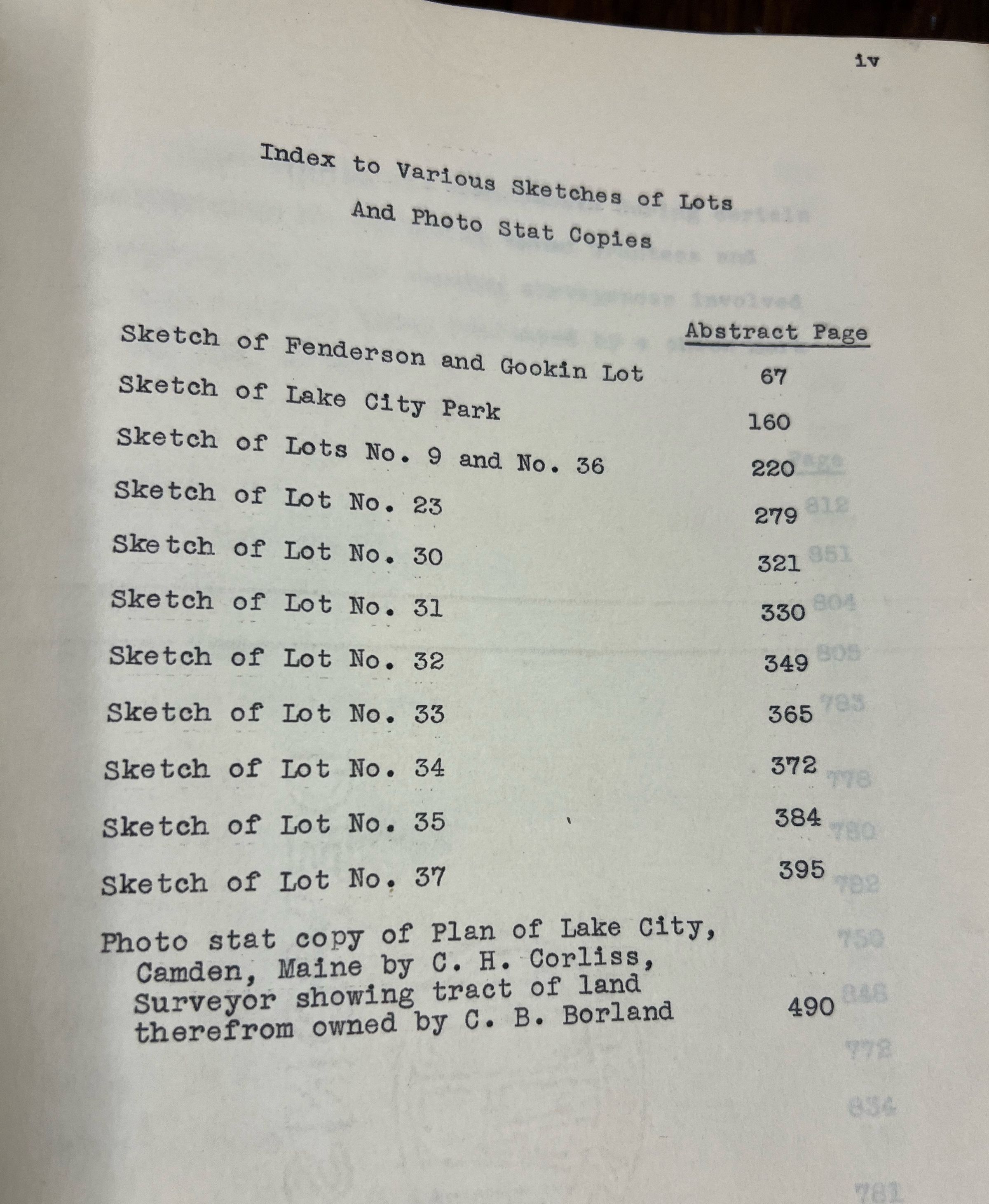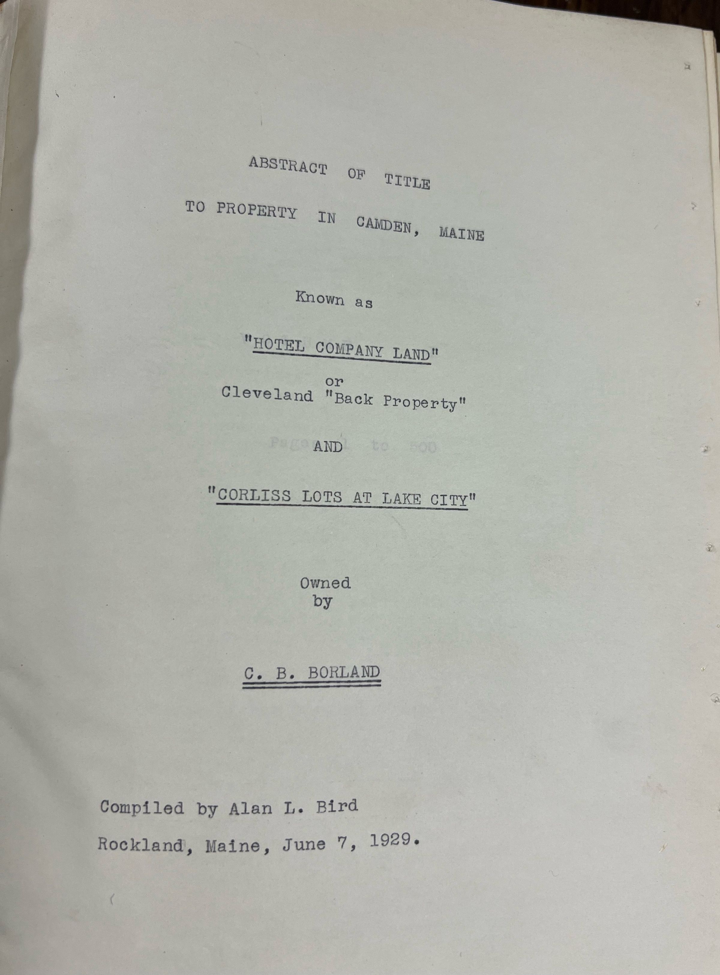 Abstract of Titles to Property in Camden, Maine “Hotel Company Land or Cleveland Back Property & Corliss Lots at Lake City