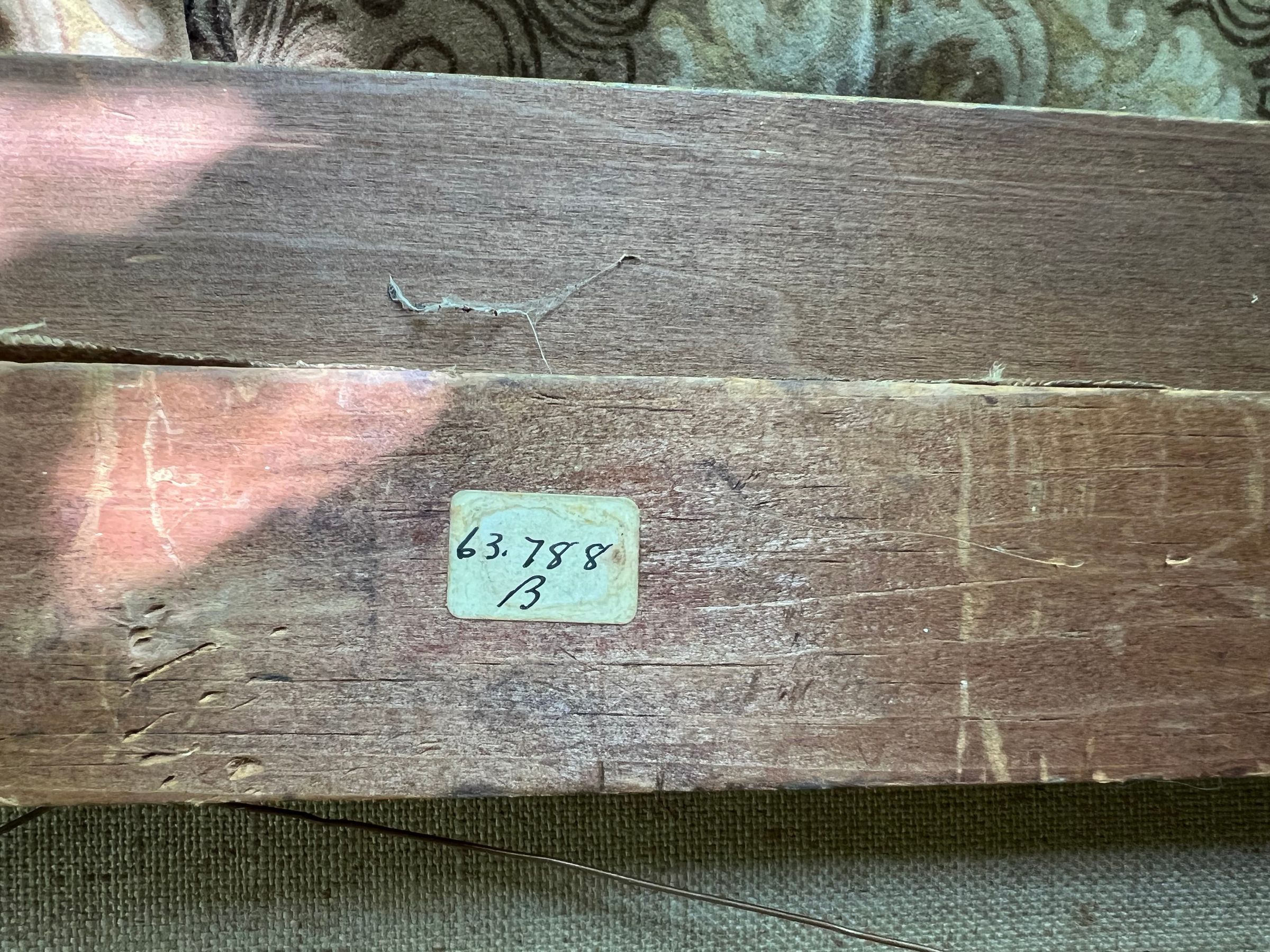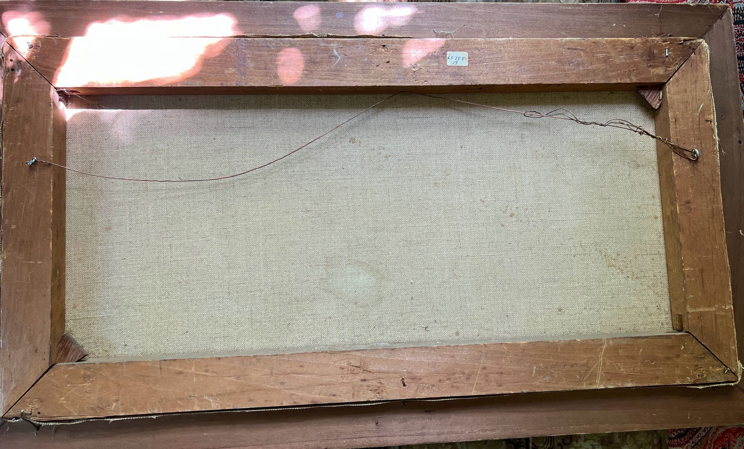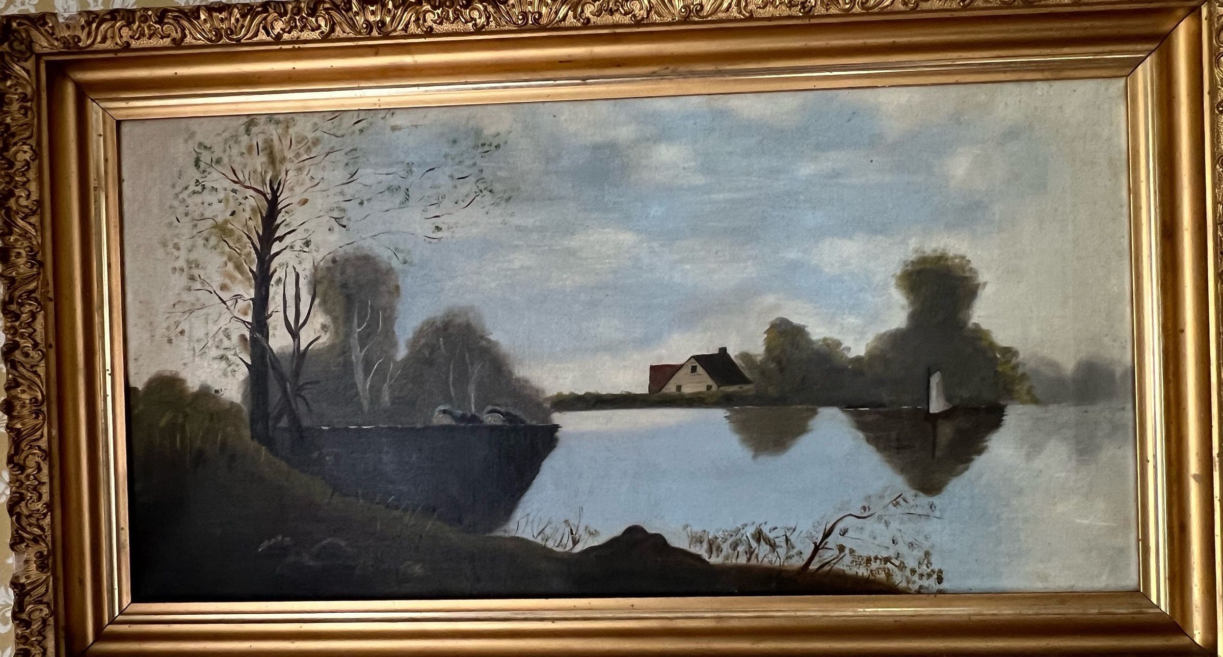 Landscape 28” x 16” w/ gilt frame, trees, house, water, boat