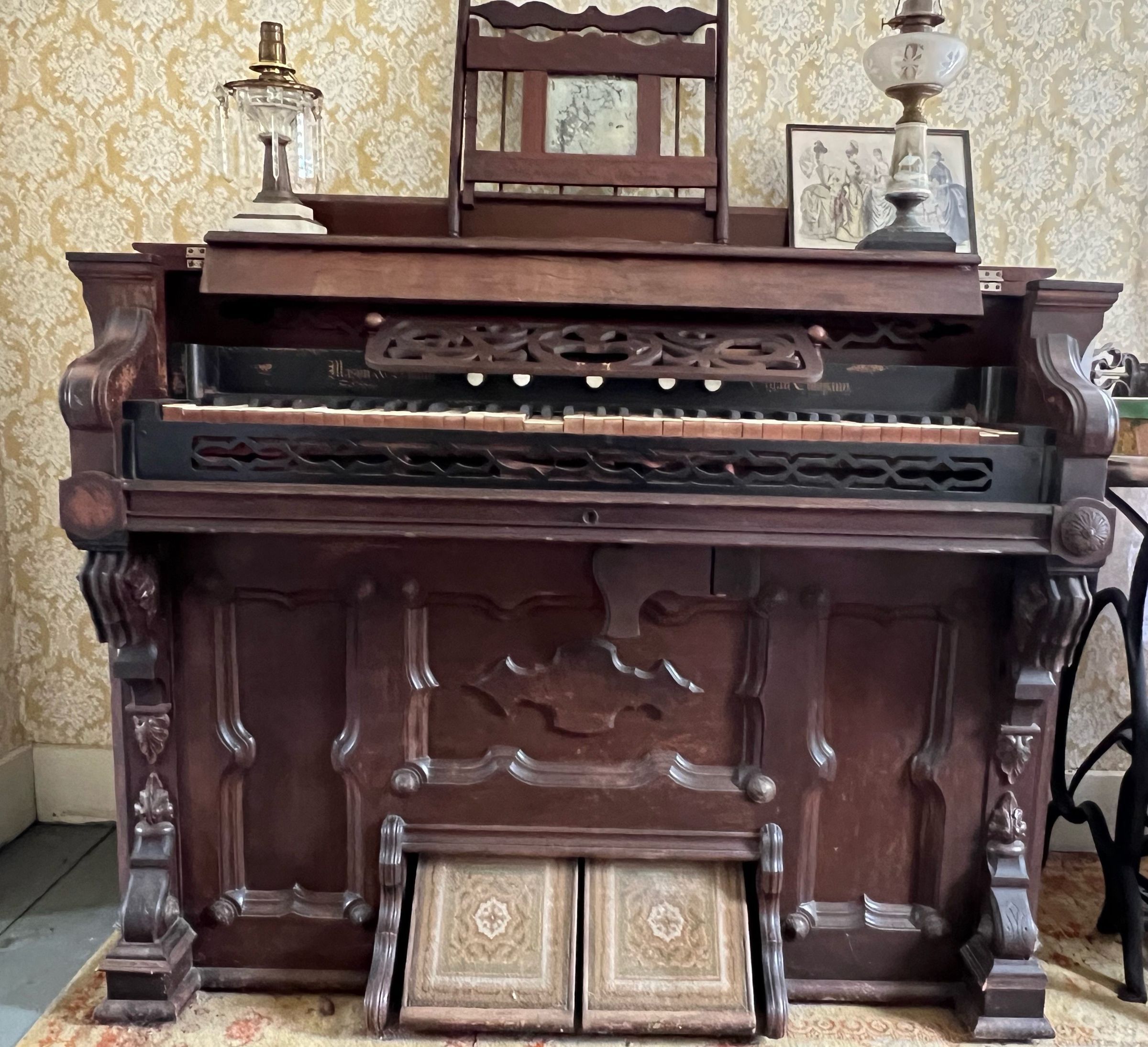 This image shows a beautifully ornate, antique wooden reed organ. The instrument’s intricate craftsmanship and Victorian design elements, such as carved floral motifs and scrolled accents, highlight its era and cultural significance, making it a charming relic of musical heritage.