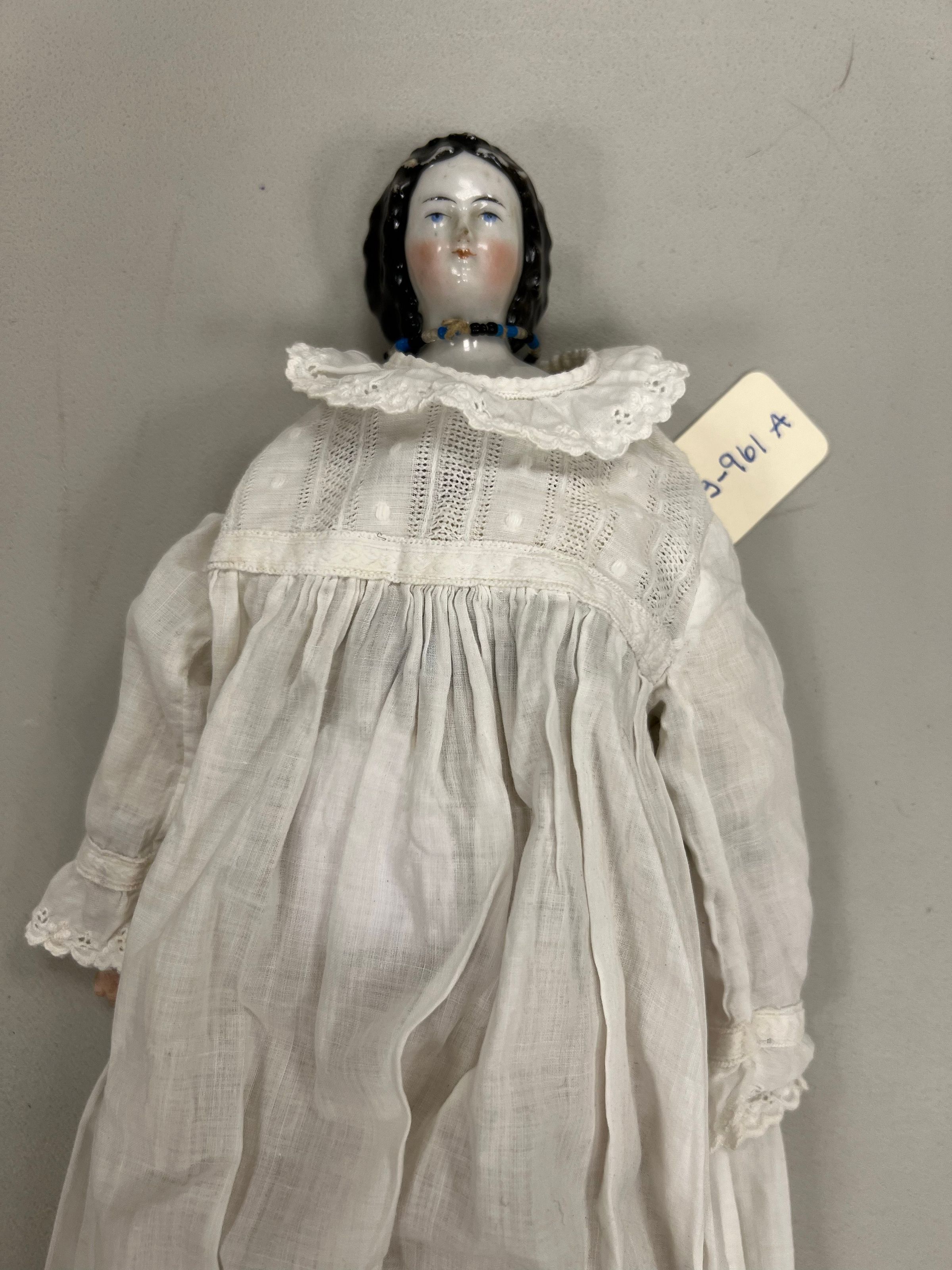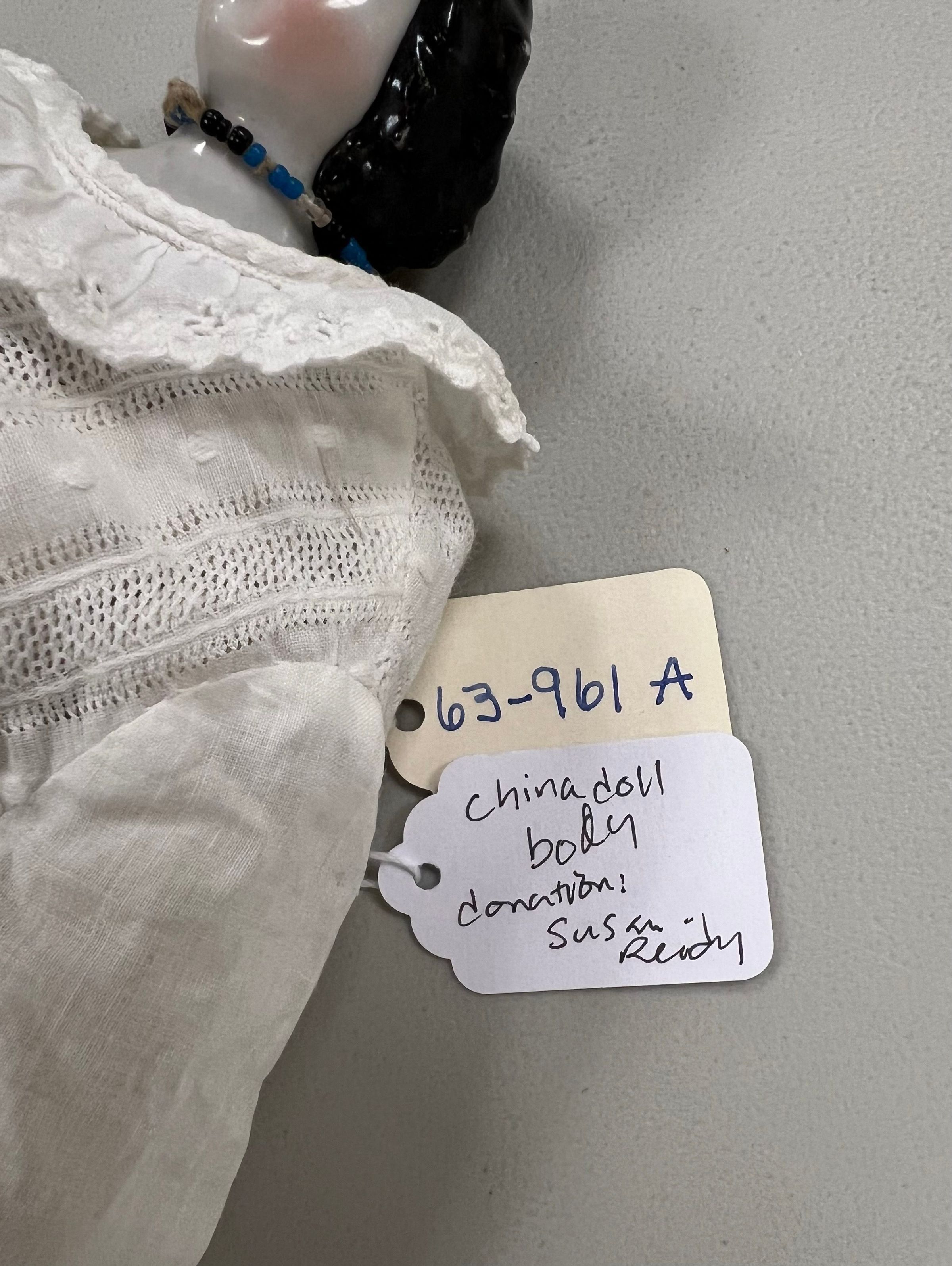 Small china doll missing arm, body replaced? Doll dress separate entry 1963.961A