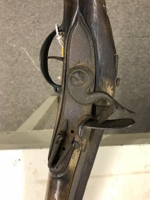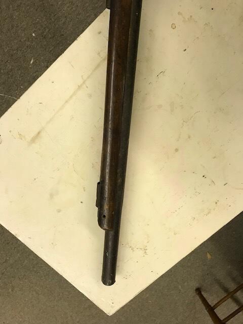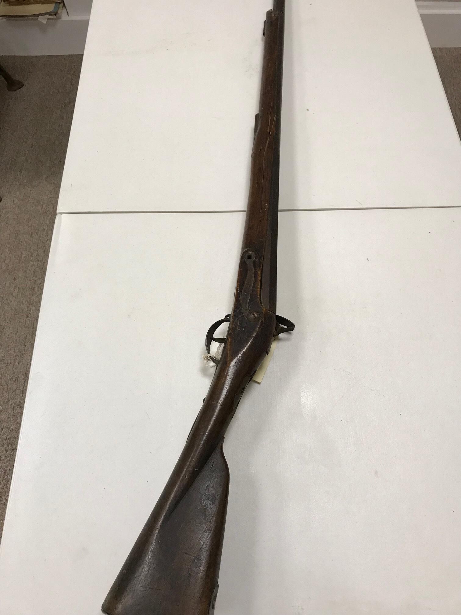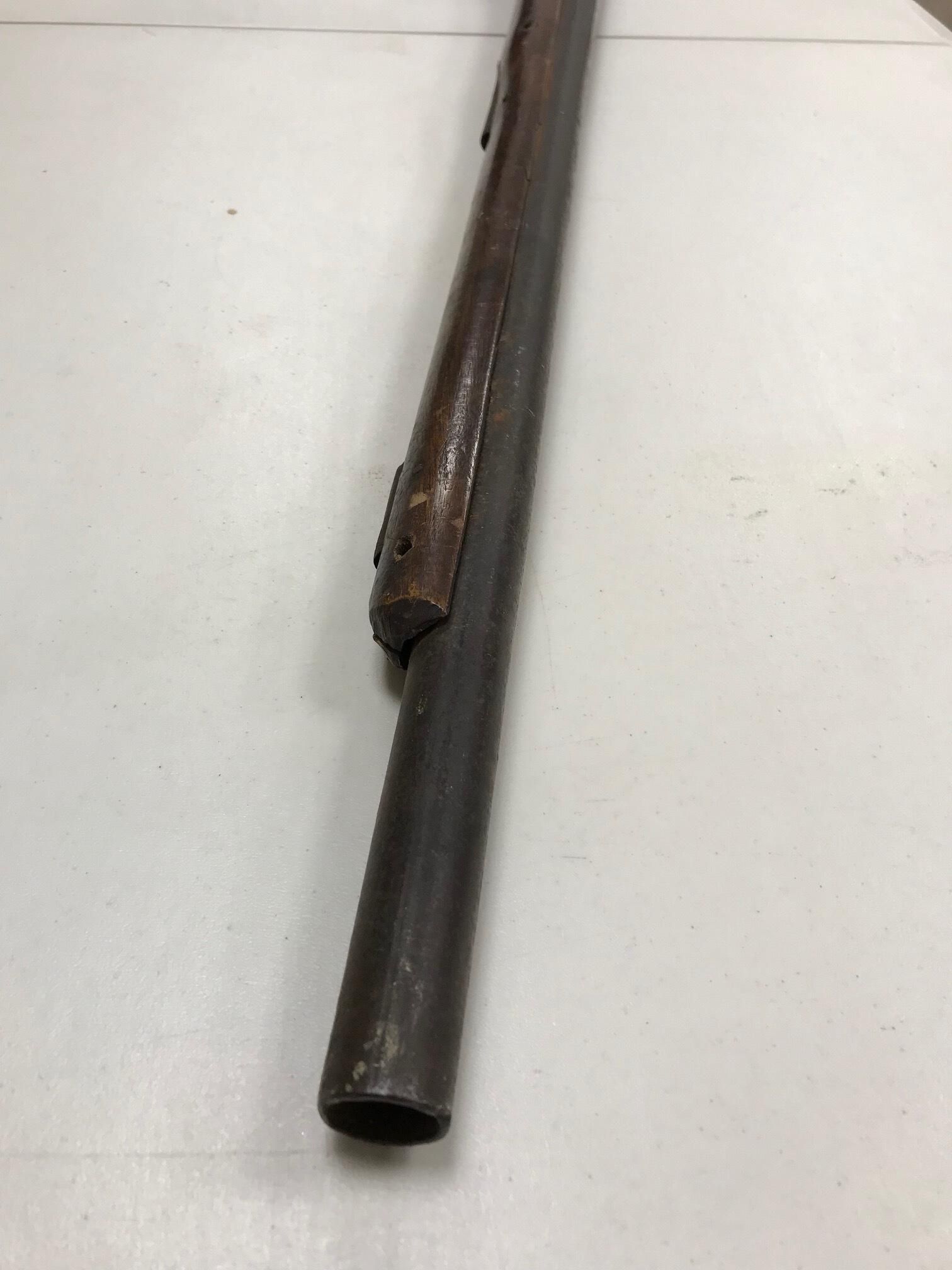 This musket has been “sporterized,” meaning the barrel and walnut stock have been shortened, decreasing the length of pull. The reasons for modification are unknown.Firearm Type