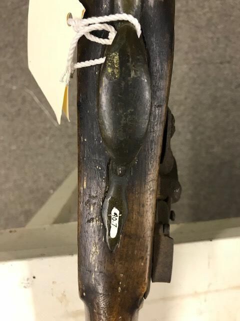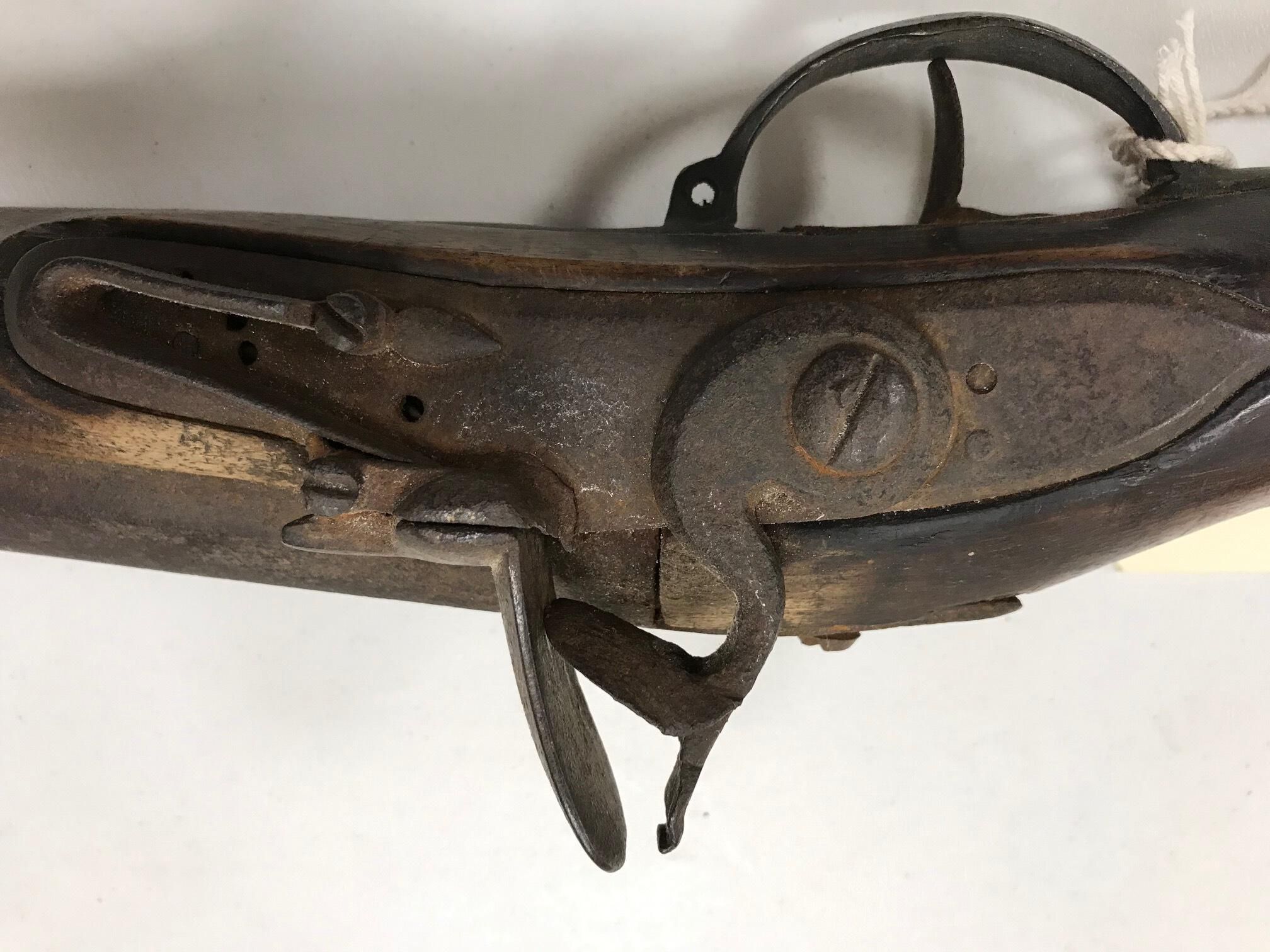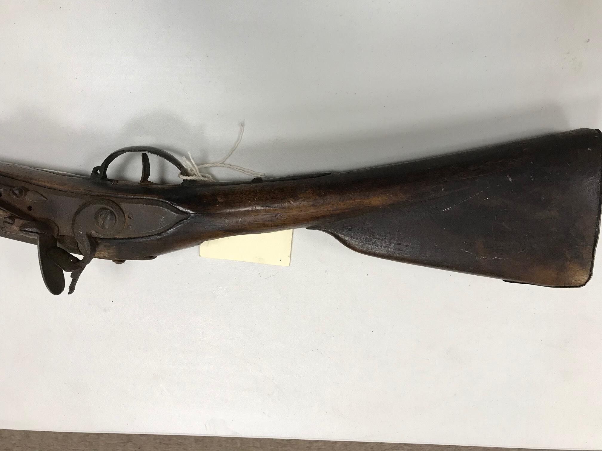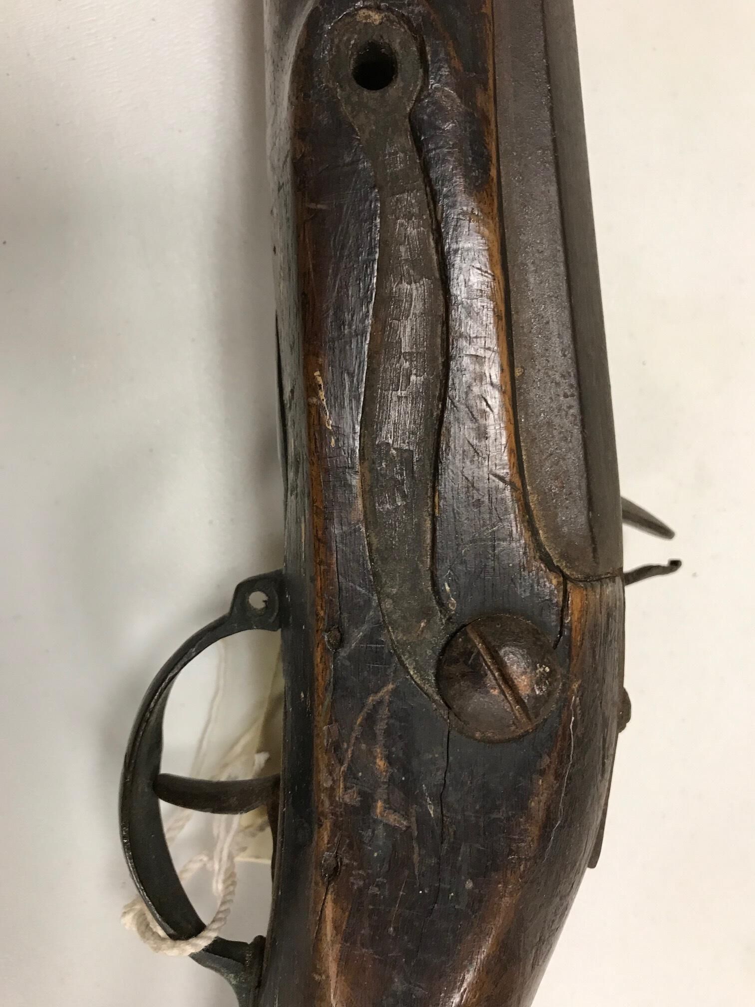 It measures 70 caliber and fired a 69 caliber lead ball with a charge of 60-70 grains of black powder. The stock is of typically British design reminiscent of the Brown Bess, the standard long gun of the British infantry. The lock appears to be of French origin and shows a very faint “B” stamp. At the time the French flintlock mechanisms were very specific as to year of manufacture, so it is likely that it can be positively dated with further research.