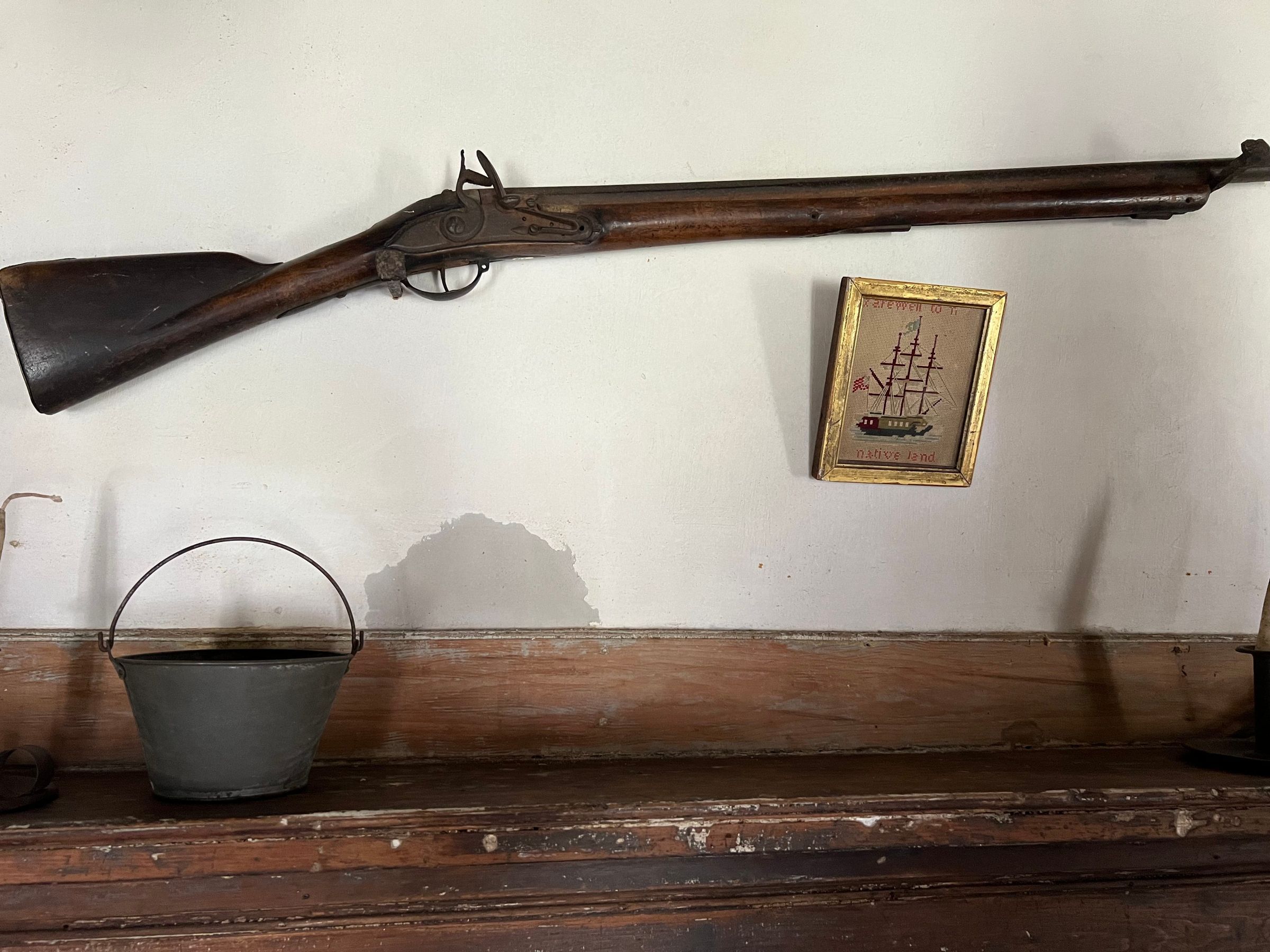 Called a “Colonial assemblage,” this musket was hand-fitted from various parts by an independent gunsmith around 1750. It has a narrow channel for a missing steel ramrod, and is of the type commonly used during the French & Indian Wars.