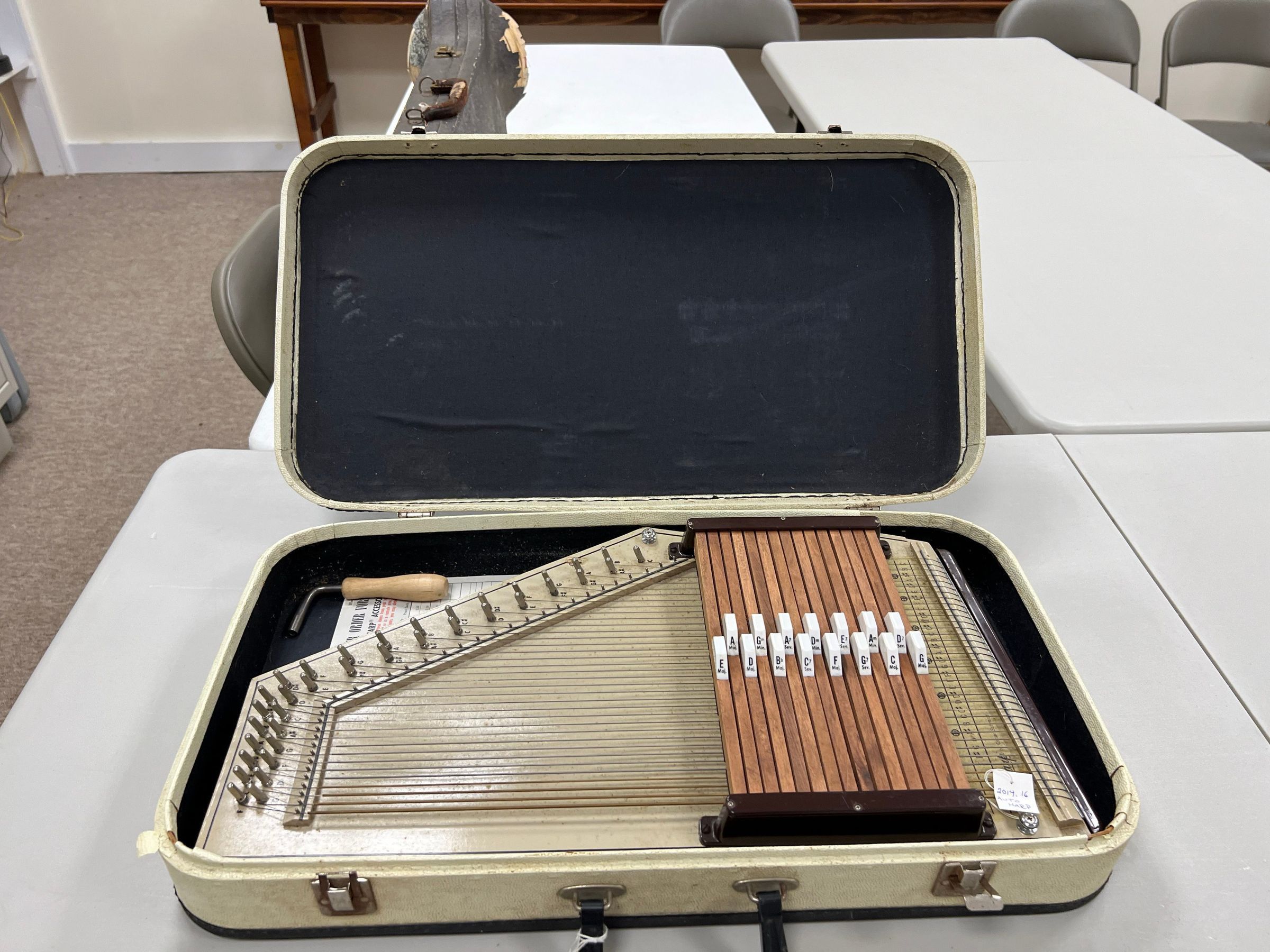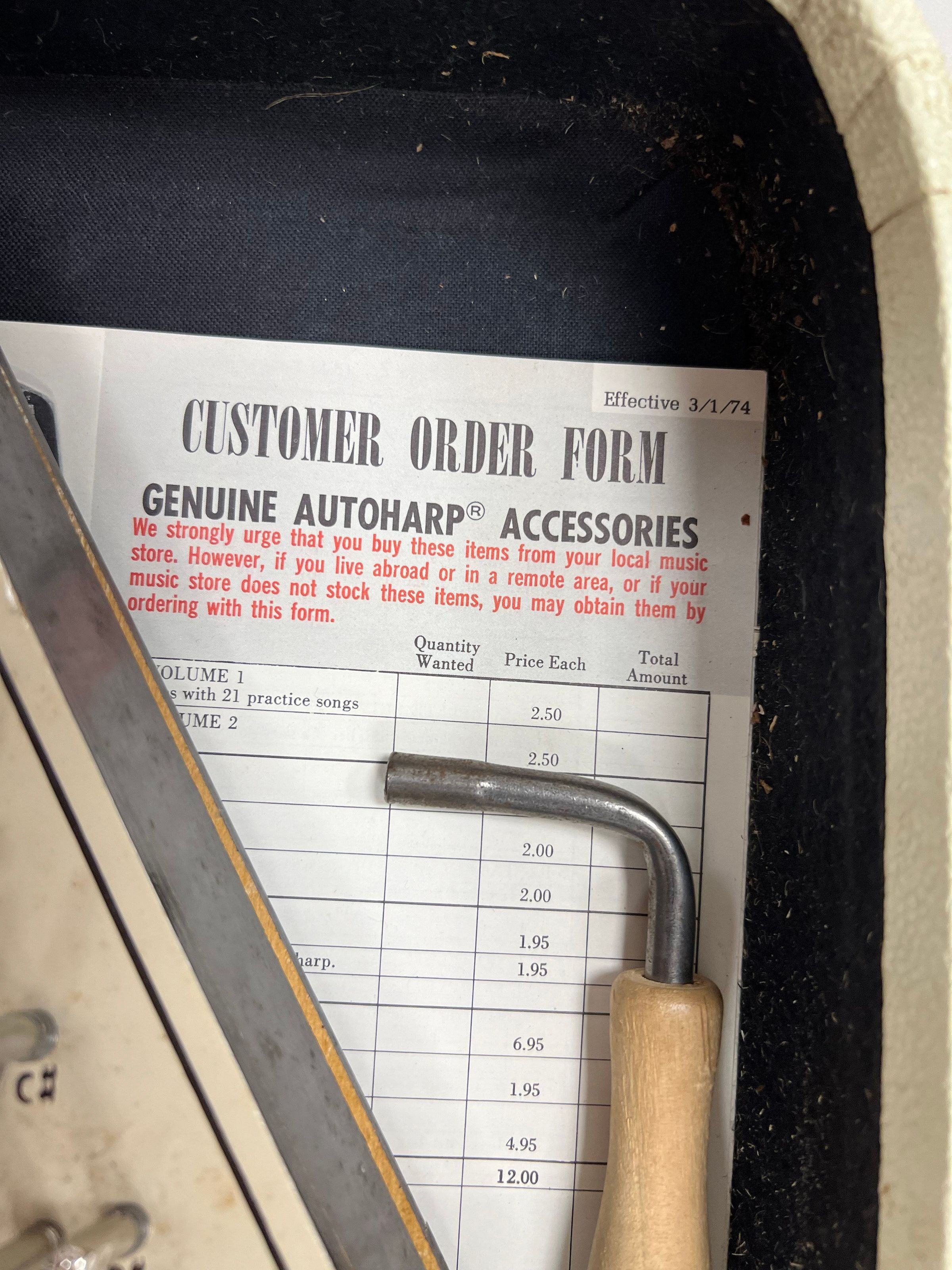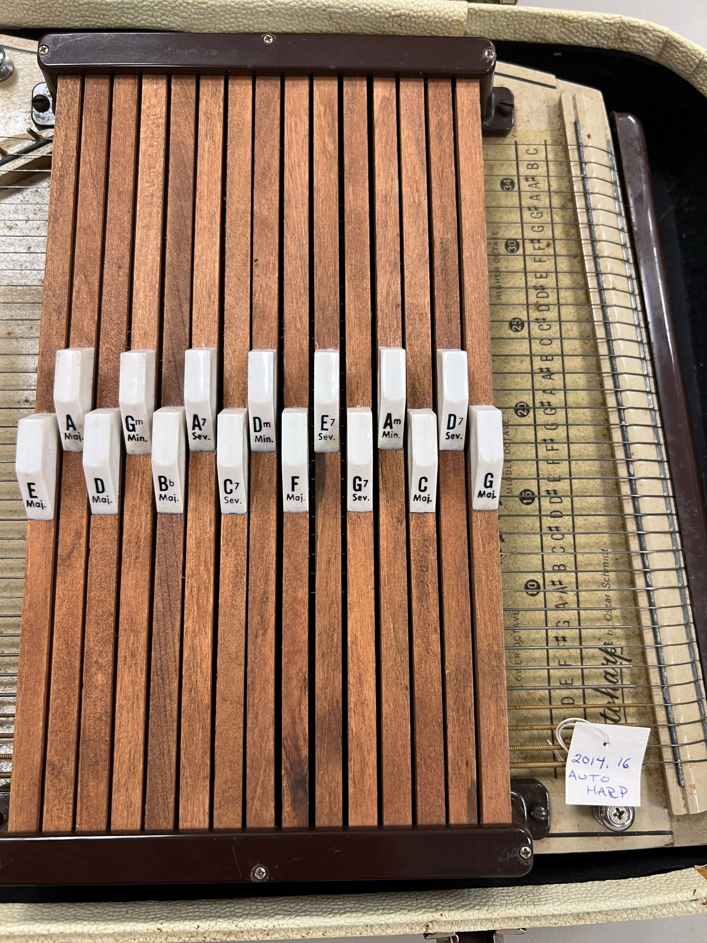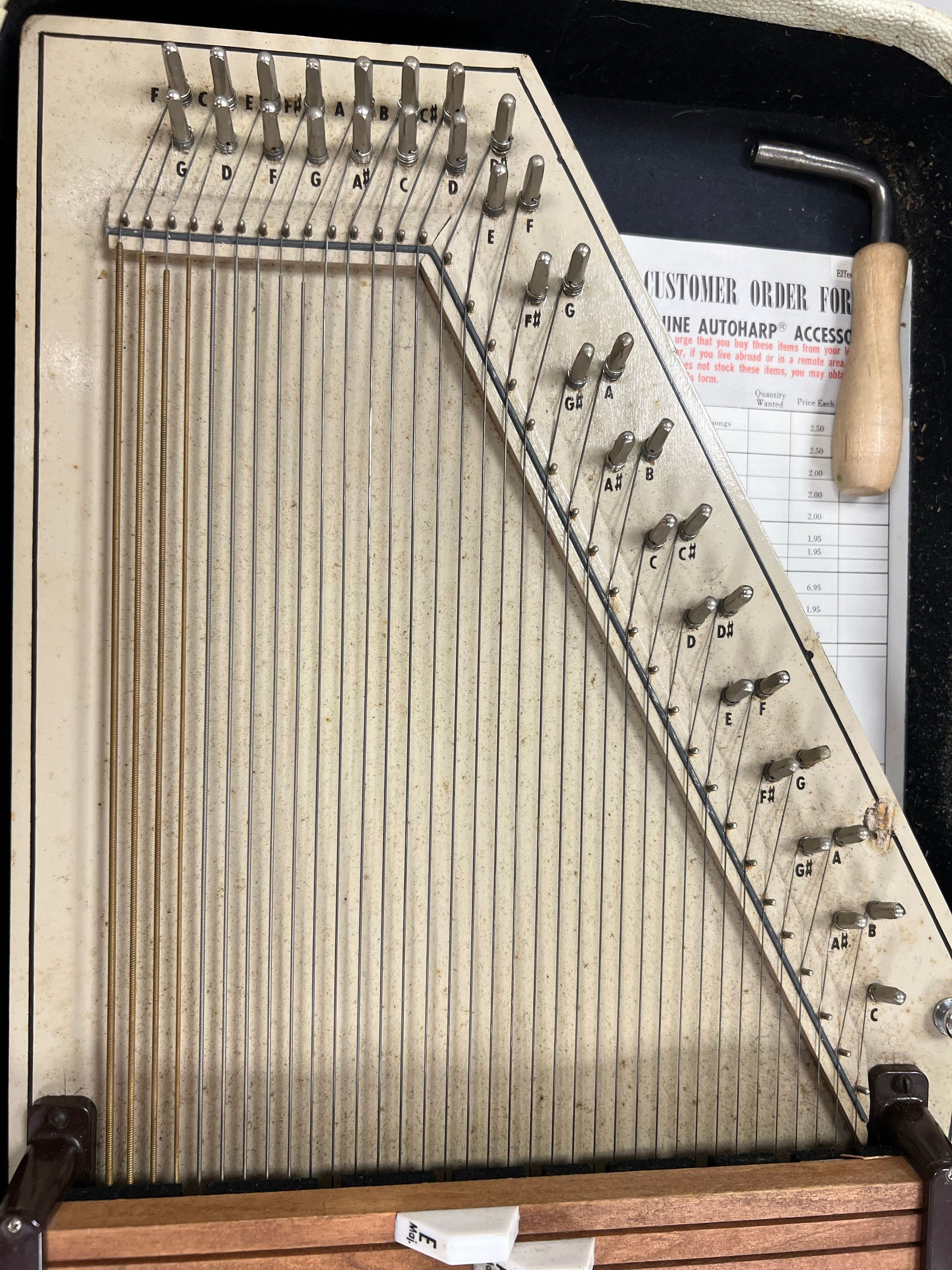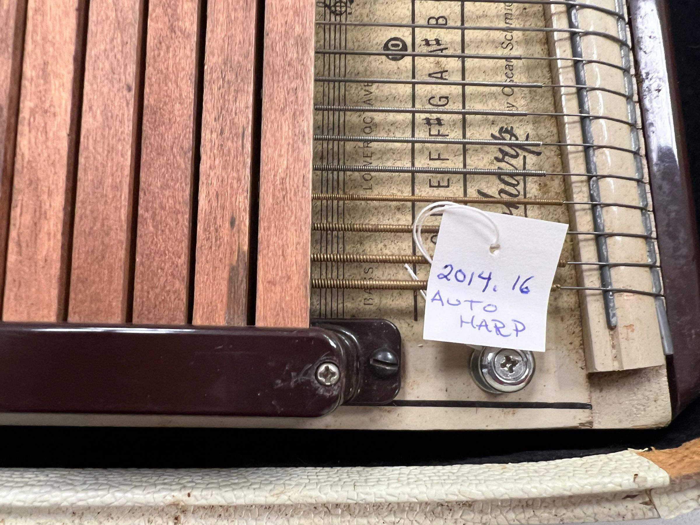 This is an Oscar Schmidt Autoharp with 12 chords 36 strings, made in the United States. C. 1970