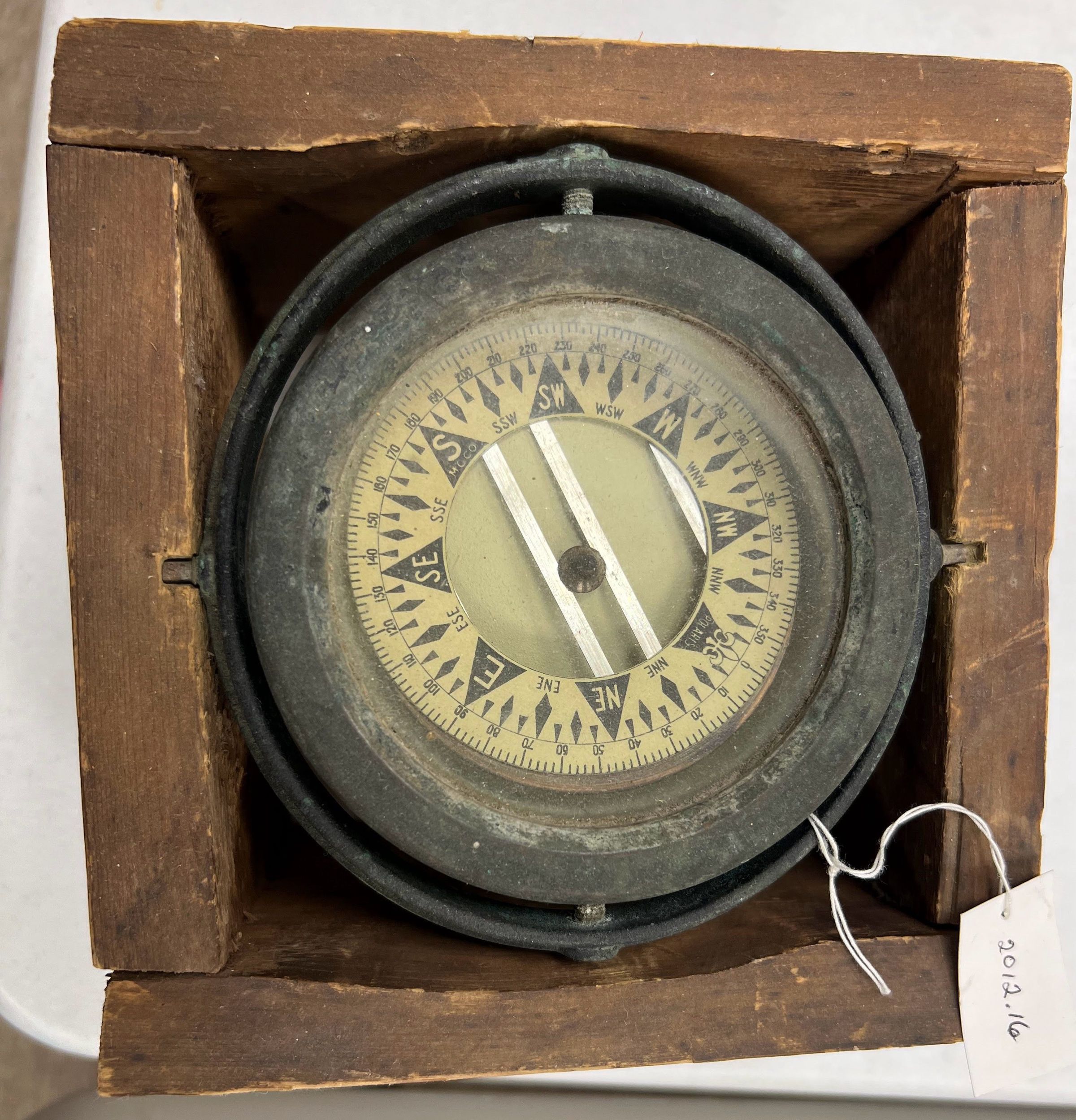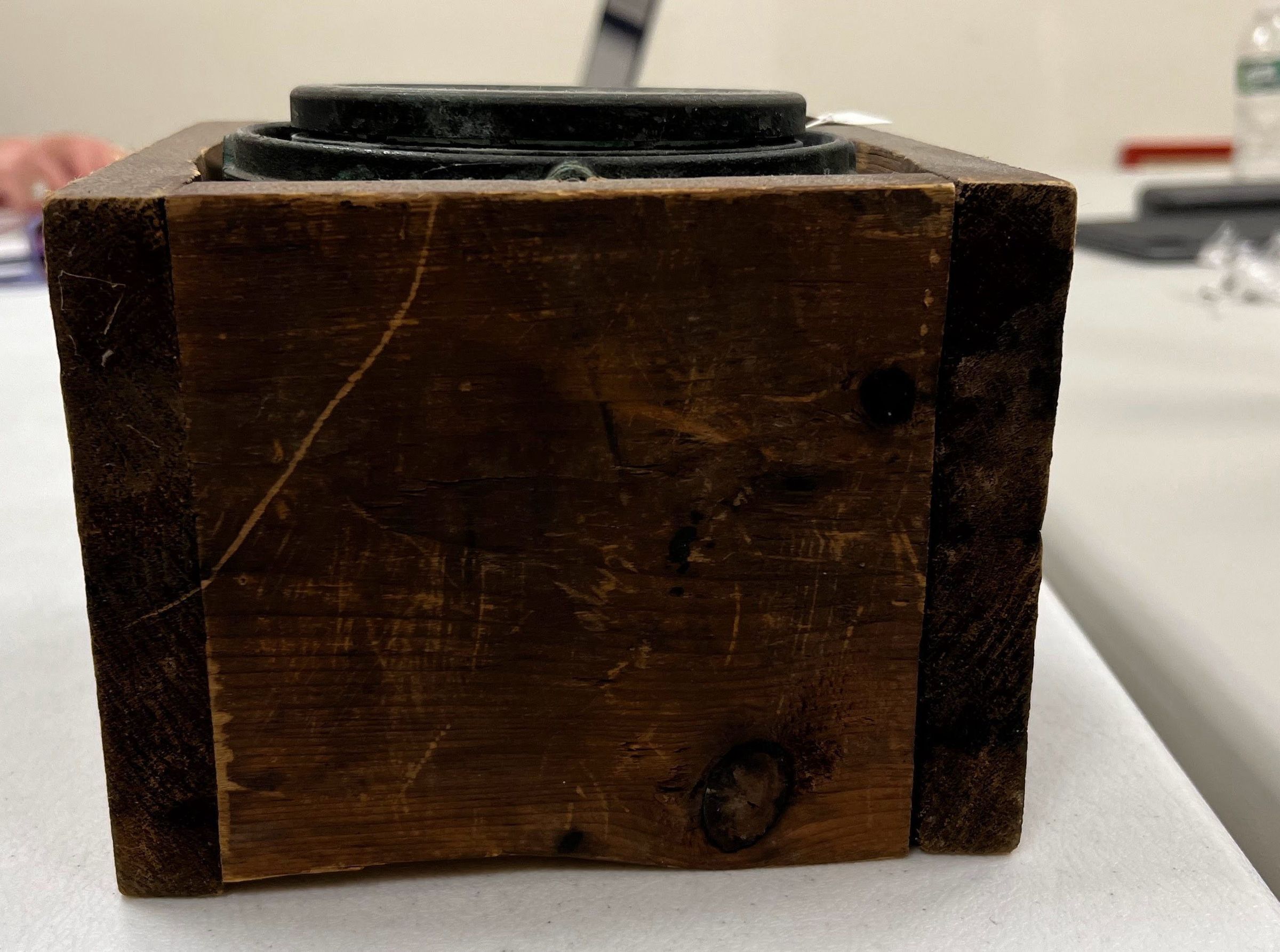 The image displays an aged compass housed in a square, wooden box. The compass, featuring a dial marked with various directional indicators such as 'N' for North and 'S' for South, appears worn and vintage. The glass cover over the compass and the rustic condition of the box suggest historical value and possibly extensive usage. This antique navigational instrument reflects a rich history of exploration and travel,