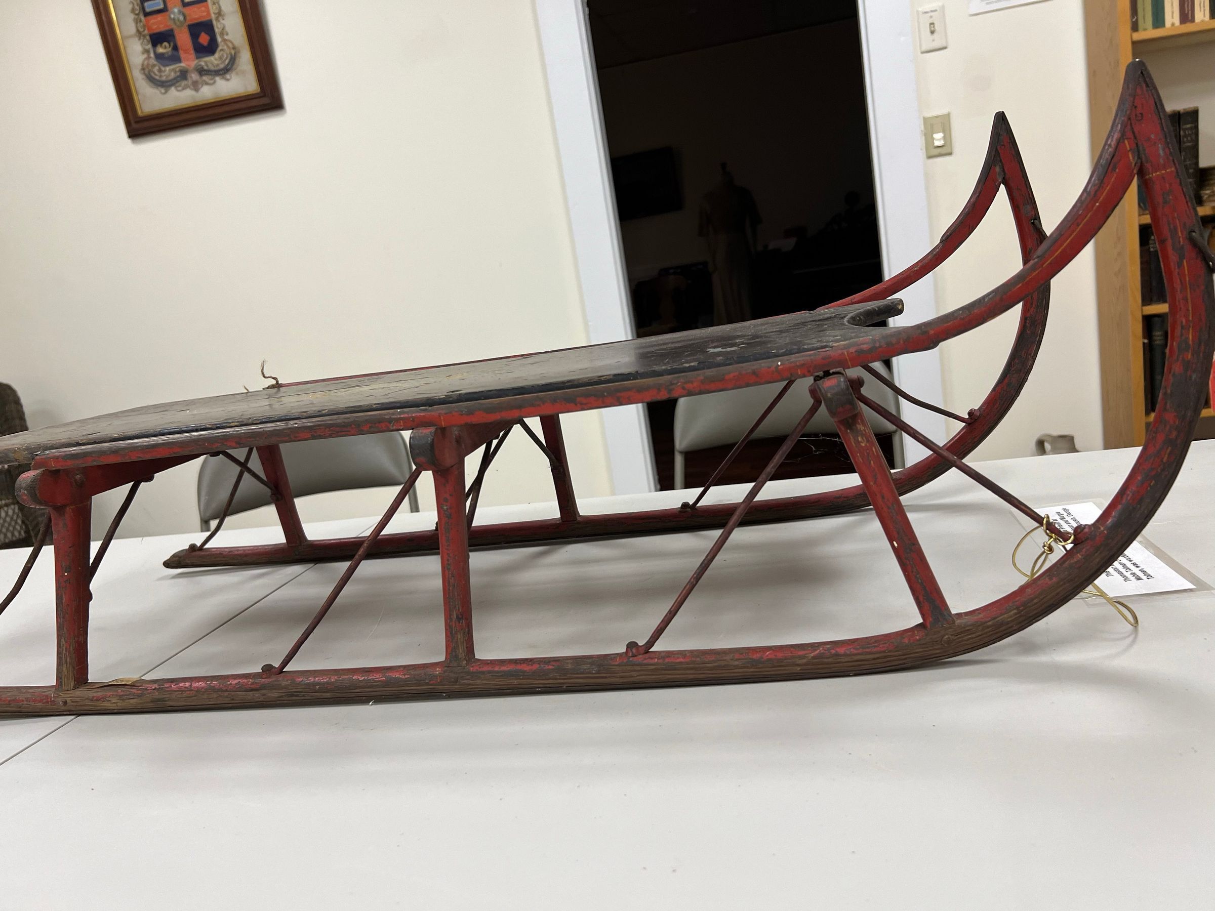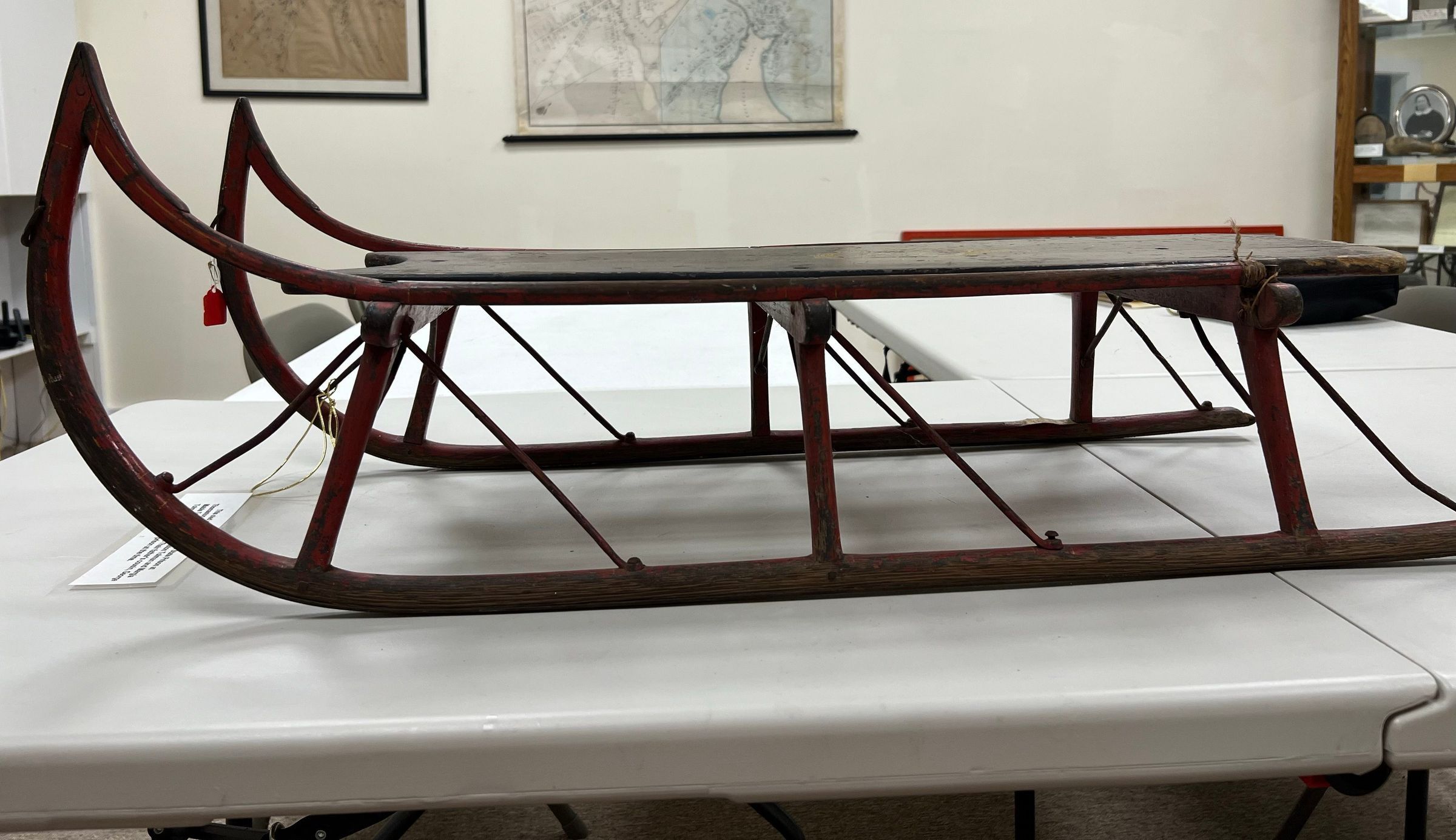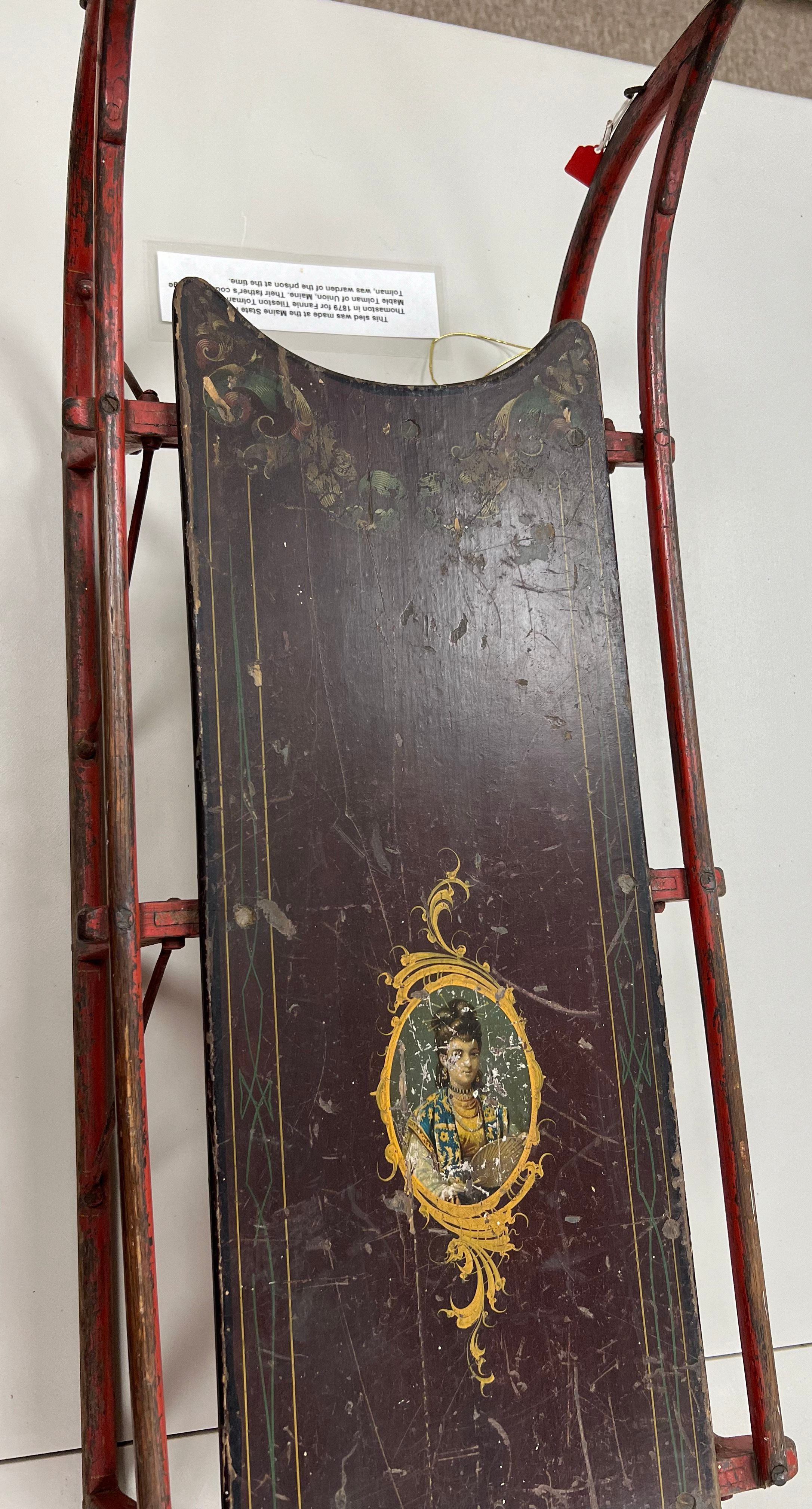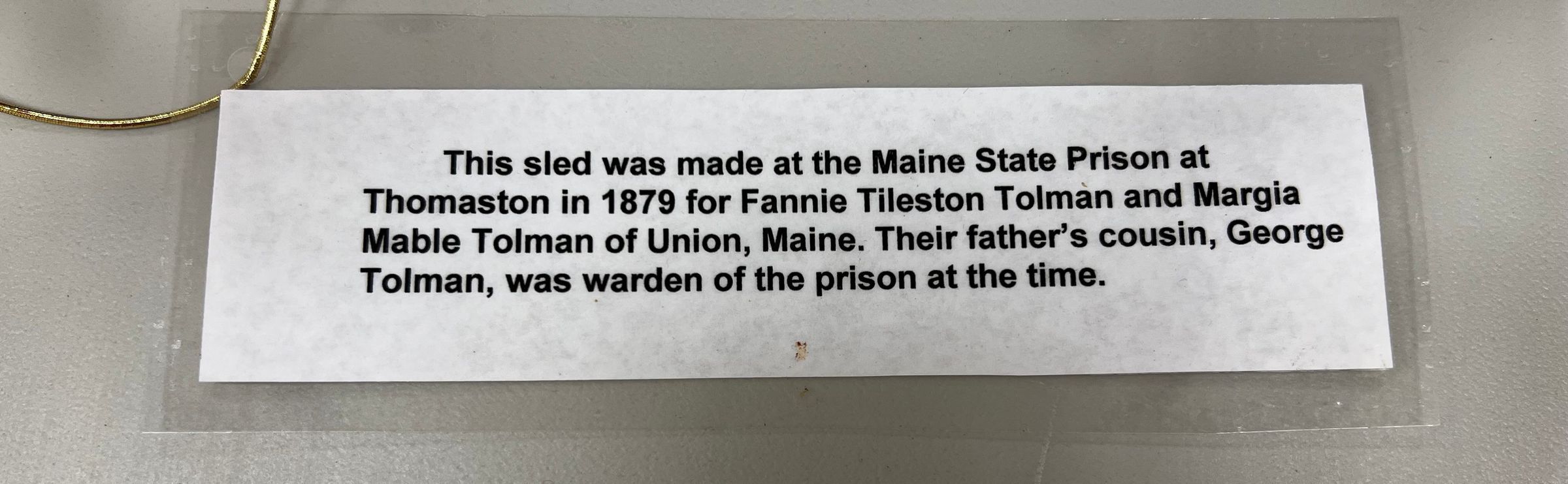 This sled was made at the Maine State Prison at Thomaston in 1879 for Fannie Tileston Tolman and Margia Mable Tolman of Union, Maine. Their father's cousin, George Tolman, was warden of the prison at the time.