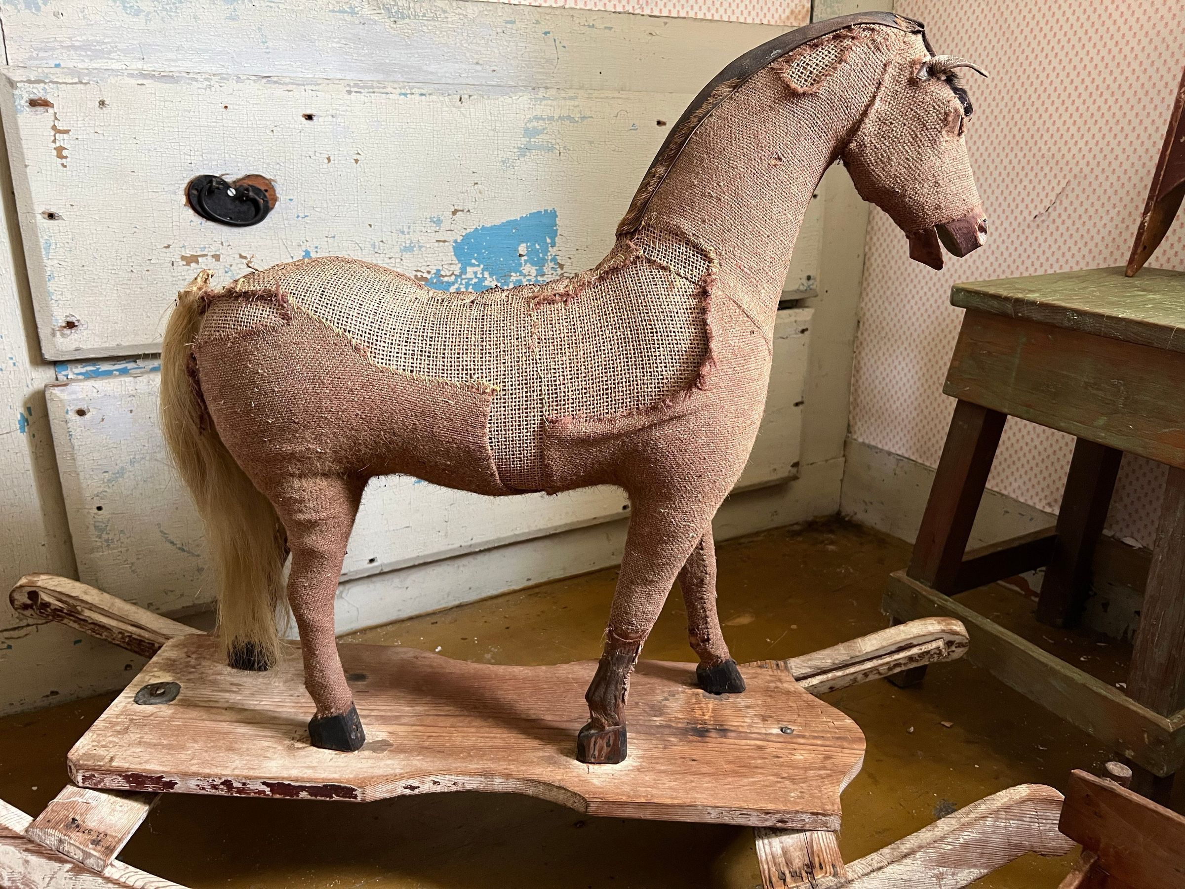 Intake states 200+ years old. Lots of wear holes, covered in burlap, leather ears, horsehair tail, worn paint