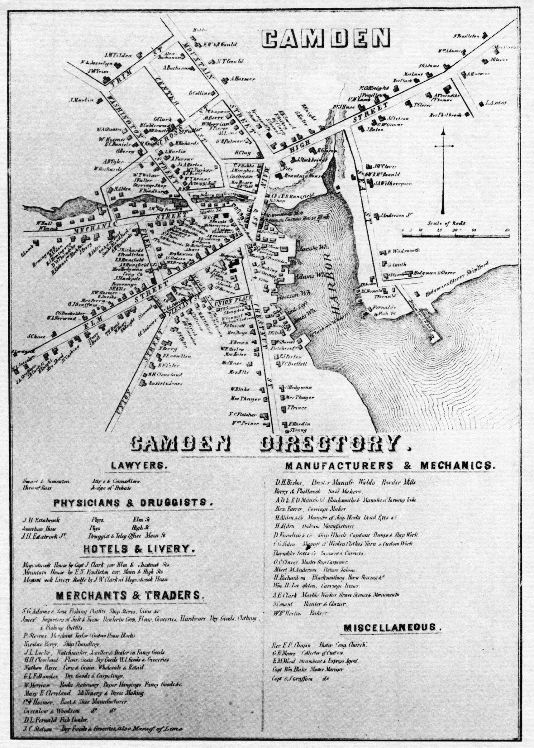 This map of Camden was drawn in 1859 and illustrates the remarkable growth of the village since the early settlers arrived in the mid-1700s. The Megunticook River and Camden harbor were the center of industry throughout the 19th century.Collection