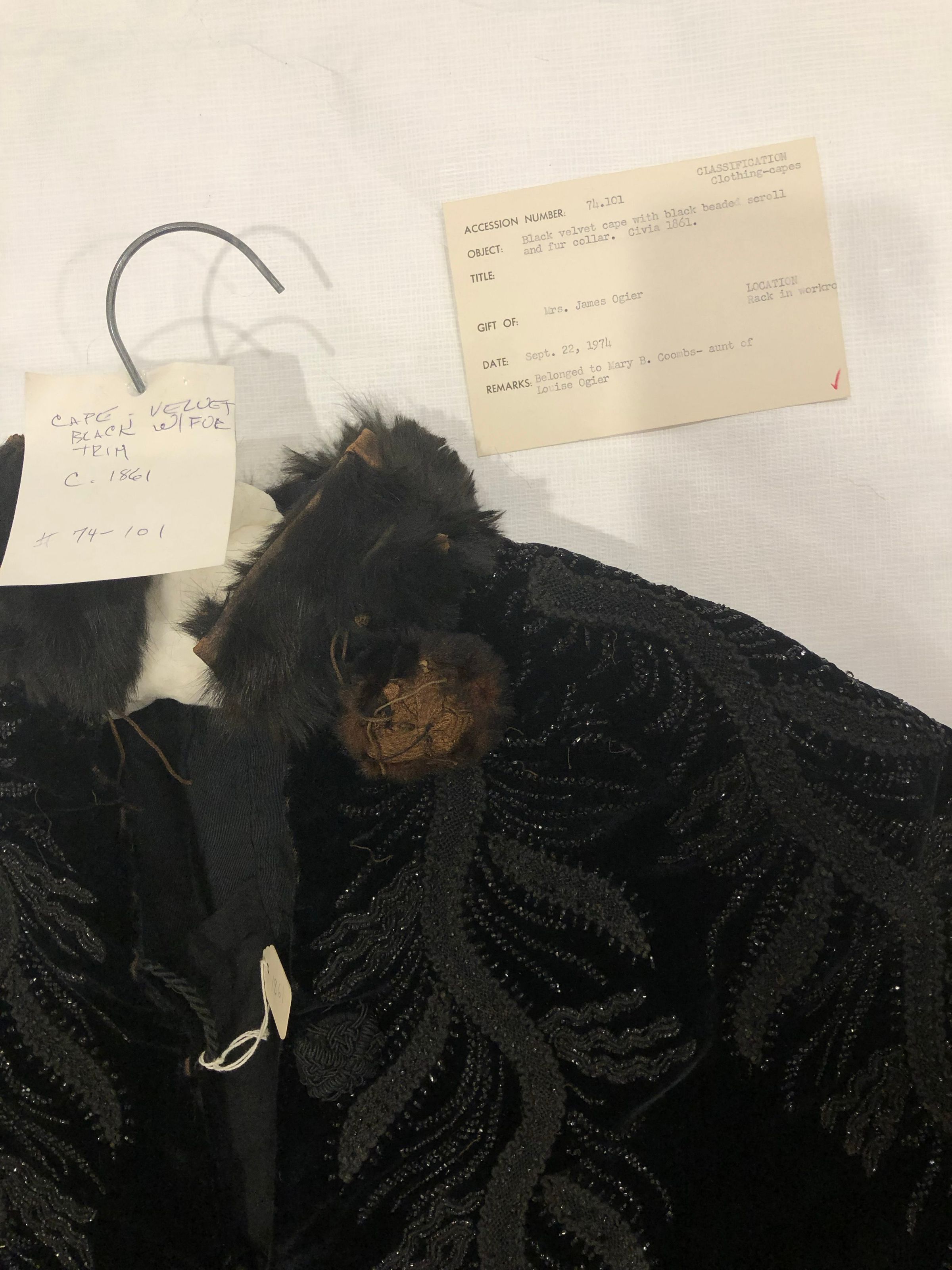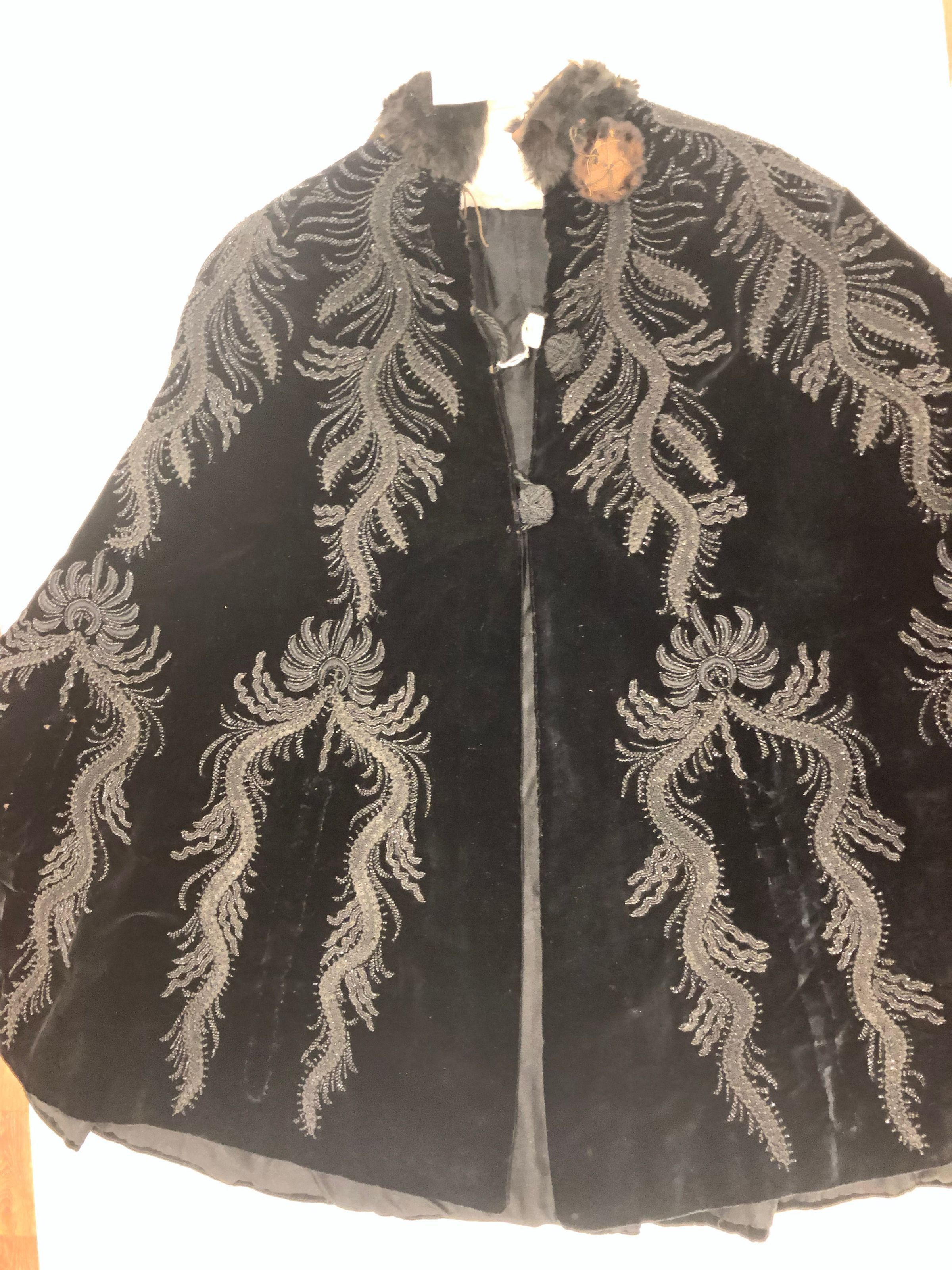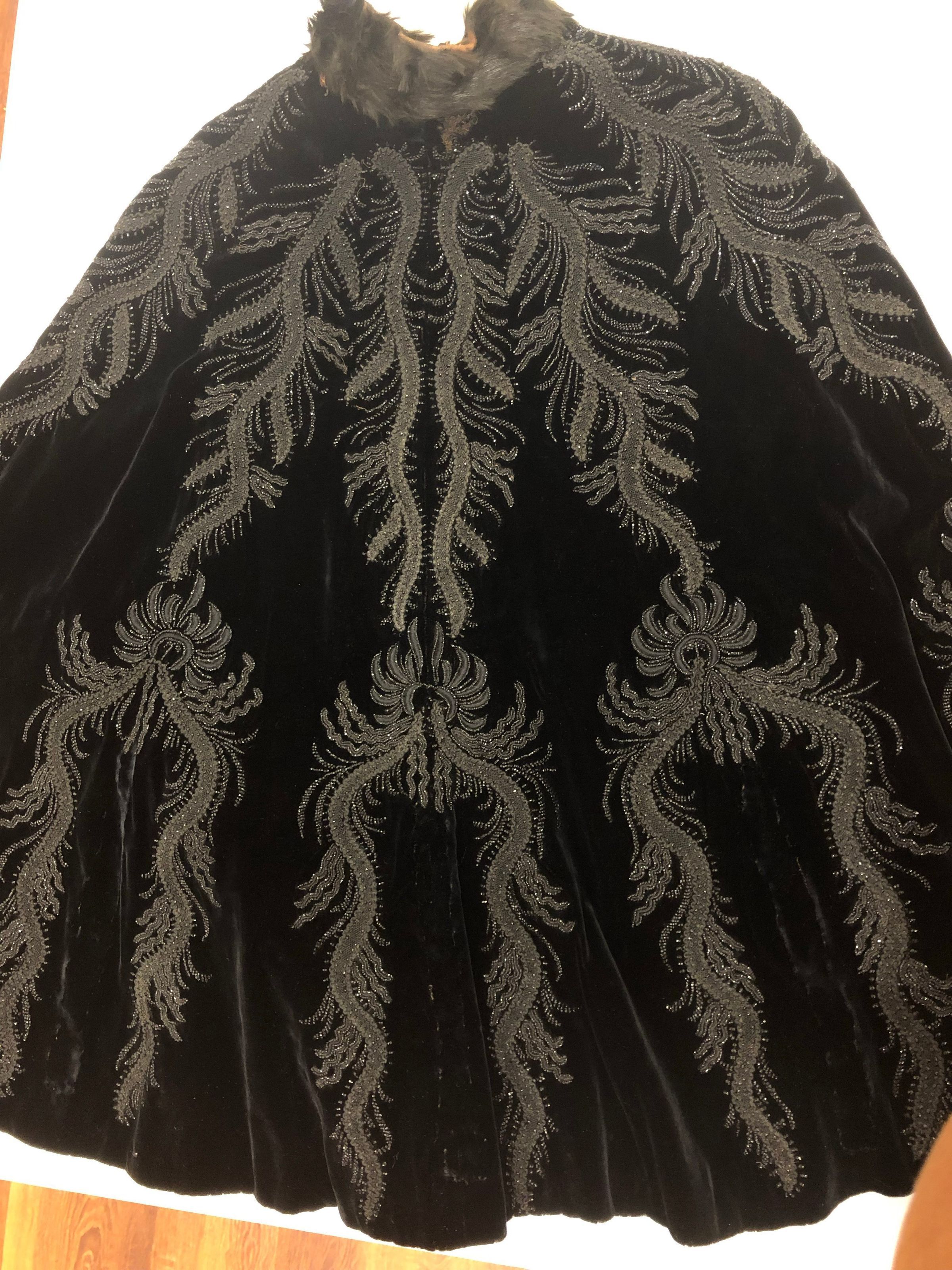 Black Velvet Cape with black beaded scroll and fur collar c. 1868