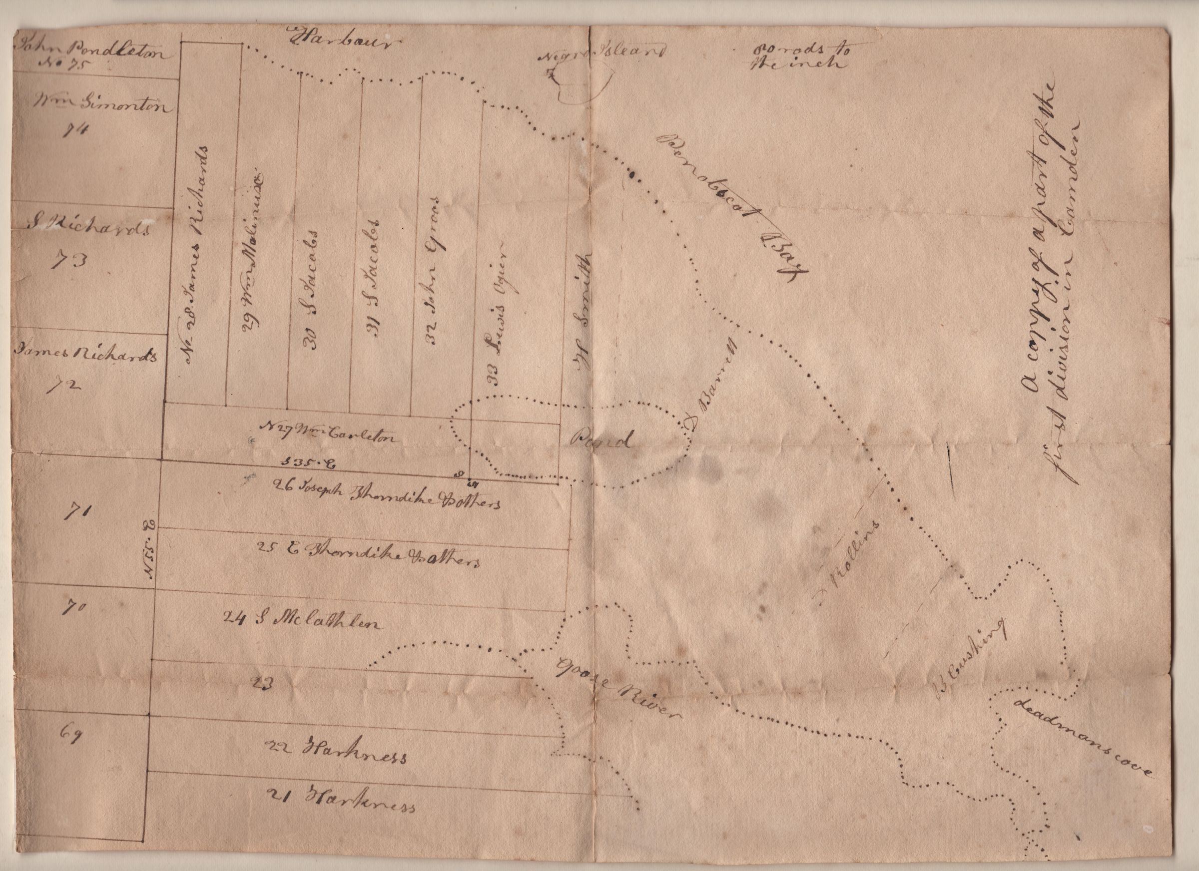 Survey of the first division of Camden. Includes lots belonging to first settlers William Simonton, John Pendleton, James Richards, William Carleton, Joseph Thorndike, William Molyneaux (Molinaux), S. Jacobs, Lewis Ogier, John Groos [Gross?], H. Smith, Daniel Barrett, D. Rollins, Benjamin Cushing, and William McGlathry. Includes Negro Island (now Curtis Island in Camden), Goose River Harbor (now Rockport), Lily Pond, and Deadman's Cove.Collection