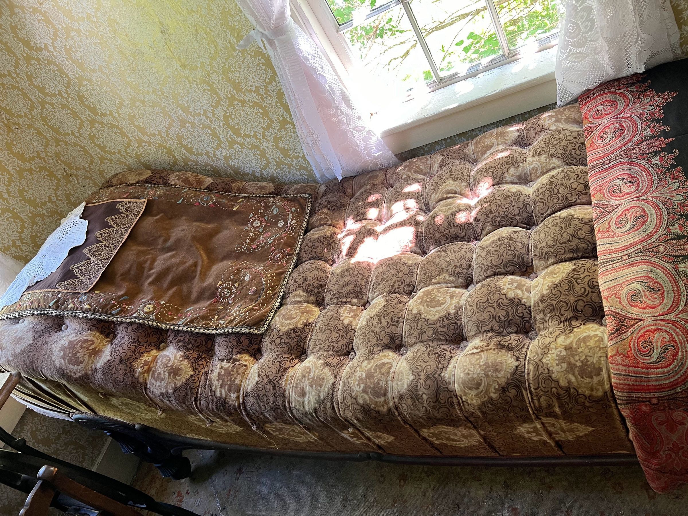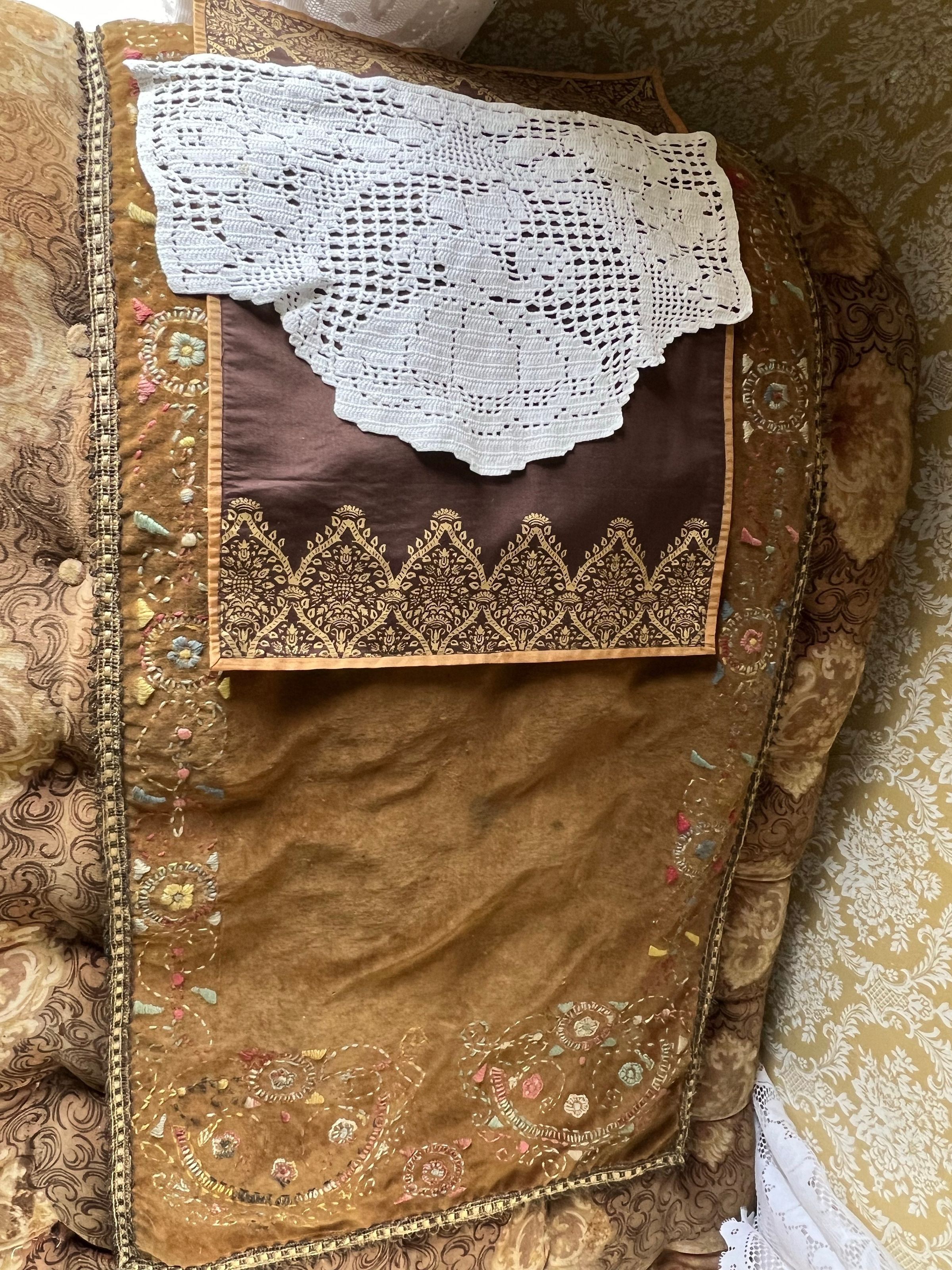 Brown velvet printed upholstery, gathers at buttons, some wear, 2 runners and doilie