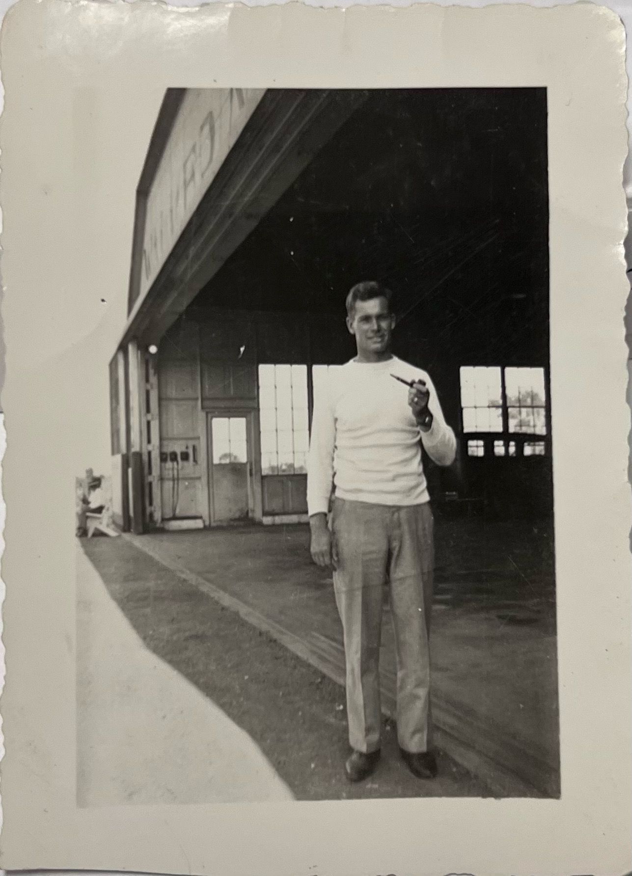 Photo of Sydney Hutnick standing in front of the main hanger of No.7 EFTSPhotograph Details