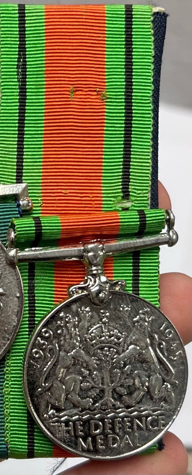 REPLICA Defence Medal, (1939 - 1945) complete with Green-Black-Orange ribbon. The green represents green and pleasant land, the black represents the black-outs, and the orange represents the firebombing.