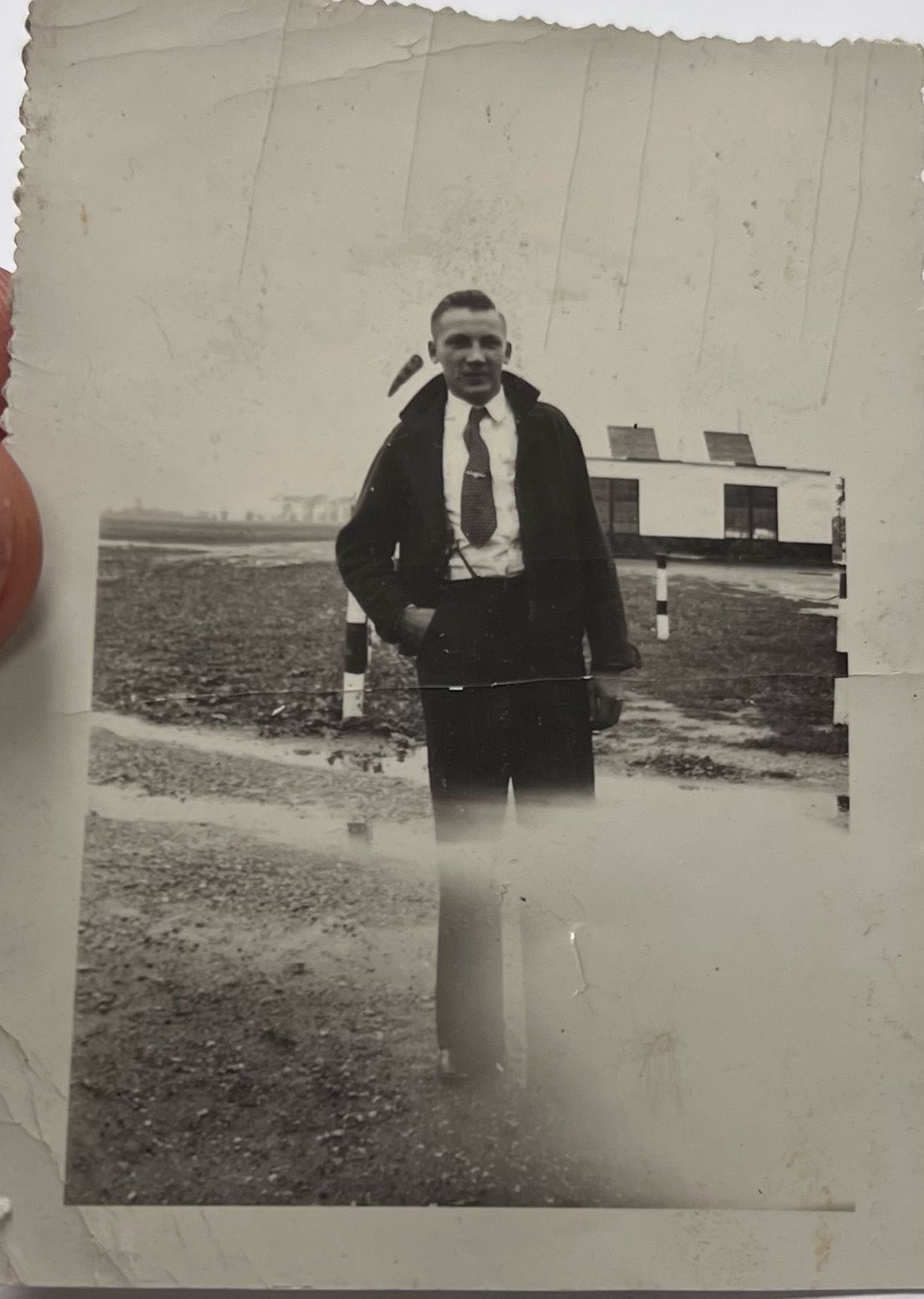 Photo of Sydney Hutnick standing at the airfield of likely the No.7 EFTS.Photograph Details