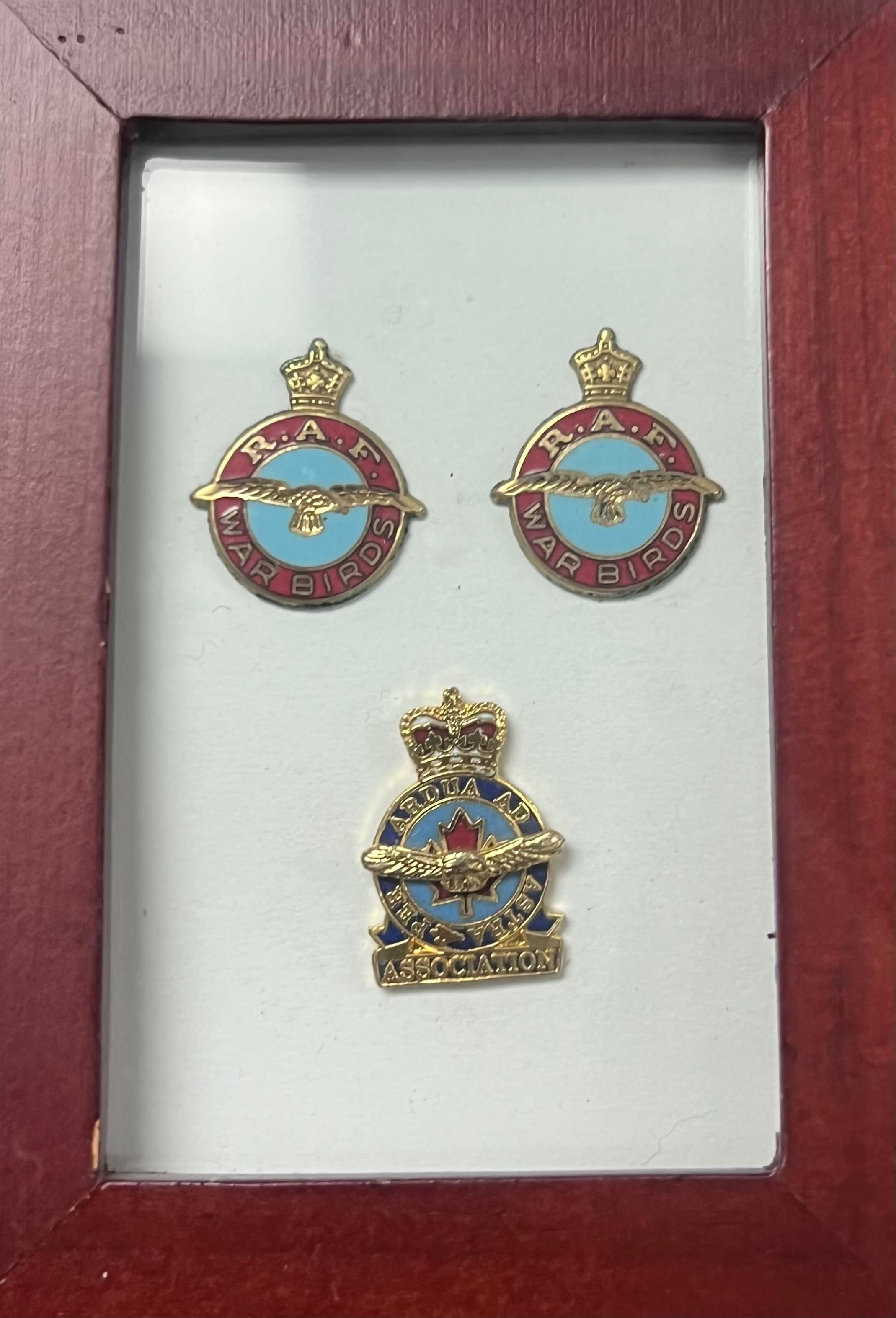 A framed example of two RAF War Birds Association metallic stickers for envelopes, and a RCAF Association Pin.Collection