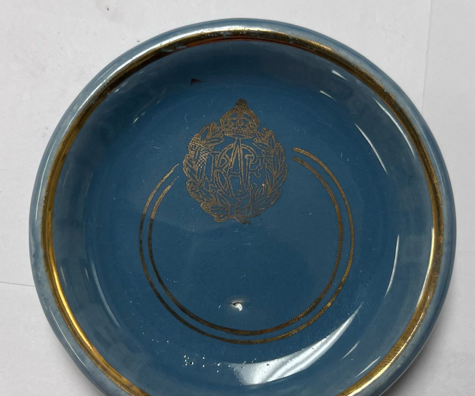 A blue saucer with gold rims, along with a gold RCAF logo.Context