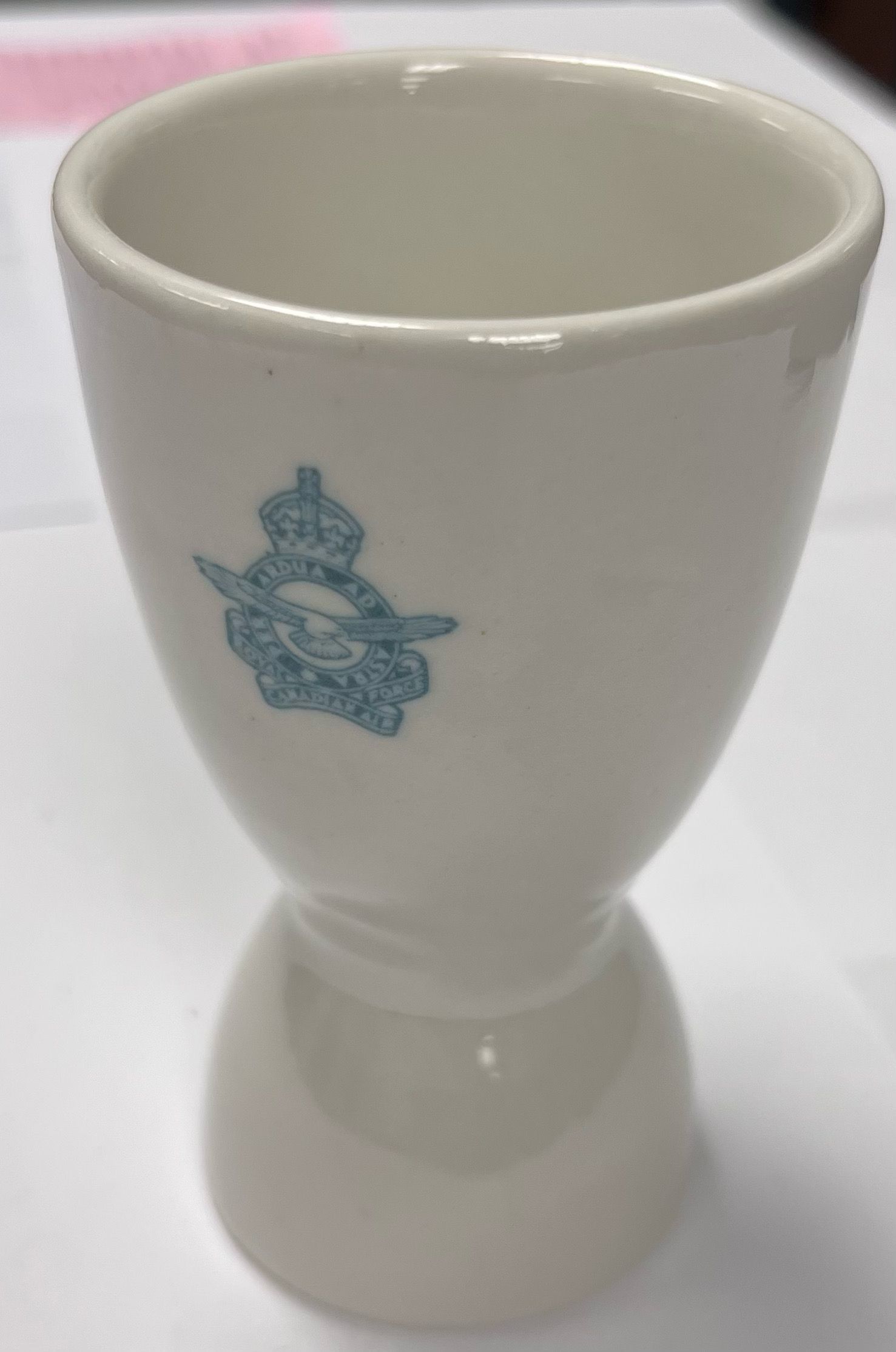 A white egg holder with a blue RCAF logo on the front.Use