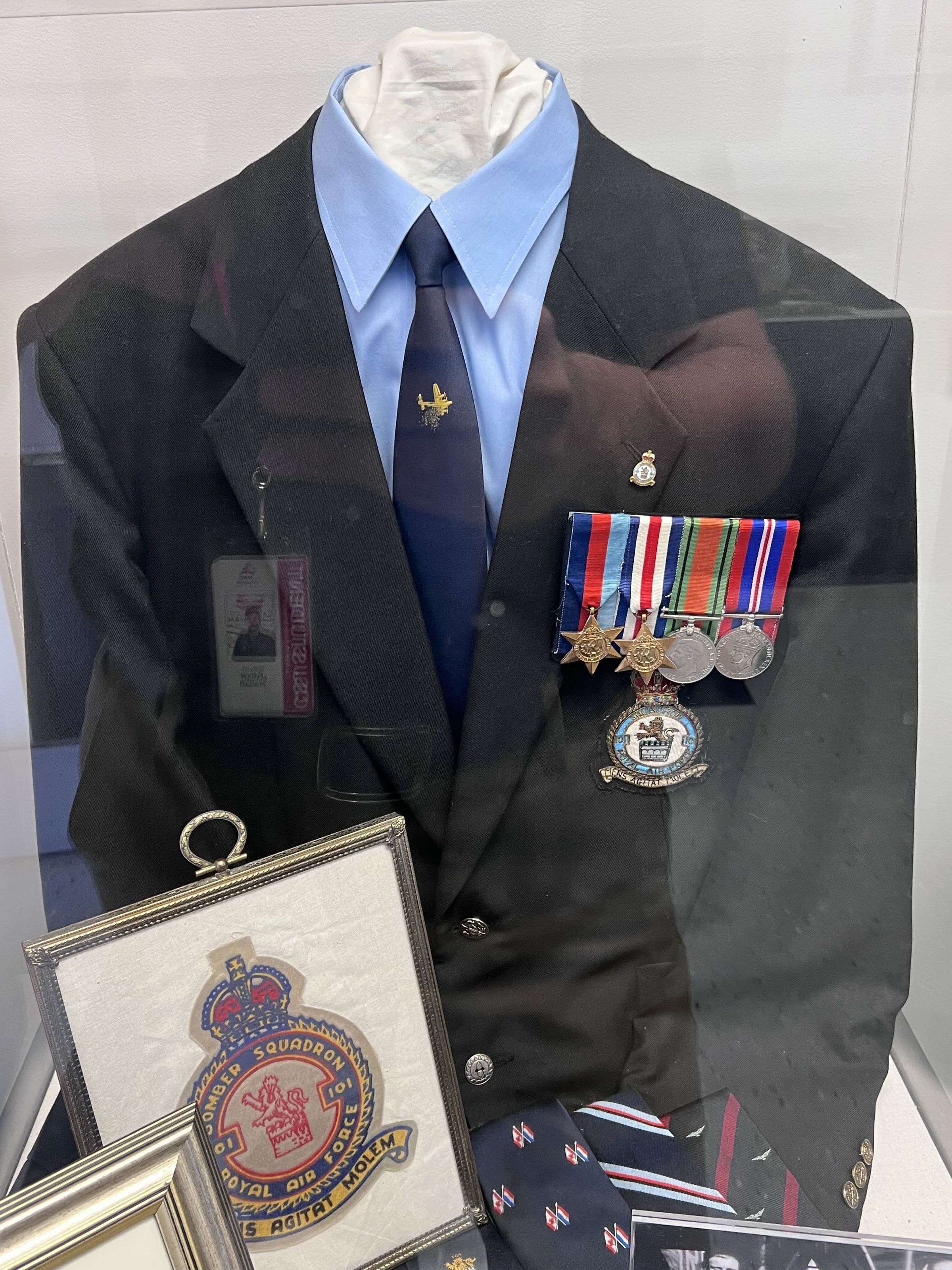 Stan Jone's Jacket he wore after the war. Has 4 medals on it, a 101 RAF patch, and a pin. The tie has a motif of a Lancaster dropping food, for Operation Manna.Relationships