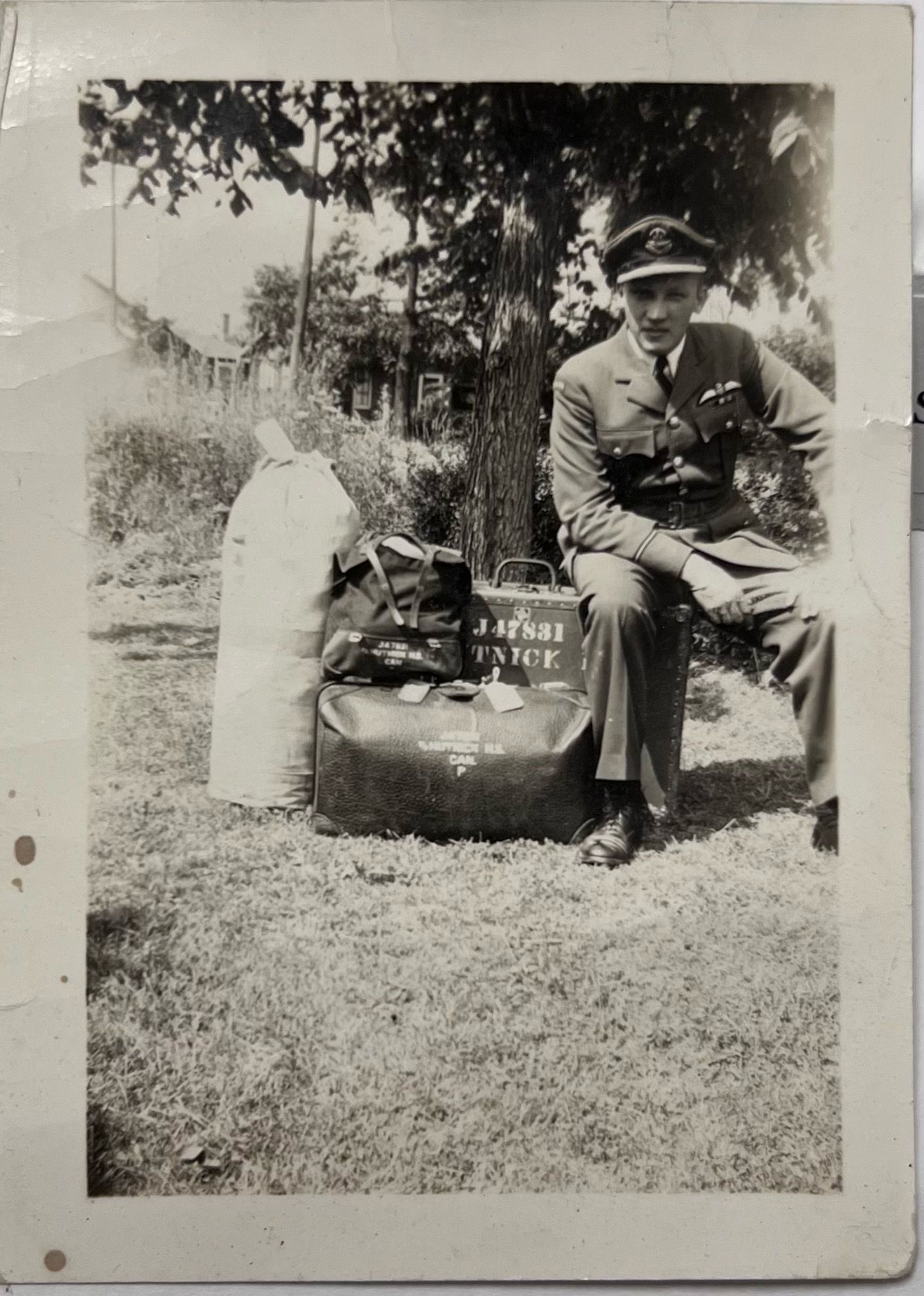 Photo of Sydney Hutnick sitting on his luggage whil in full RCAF dress uniform.Photograph Details