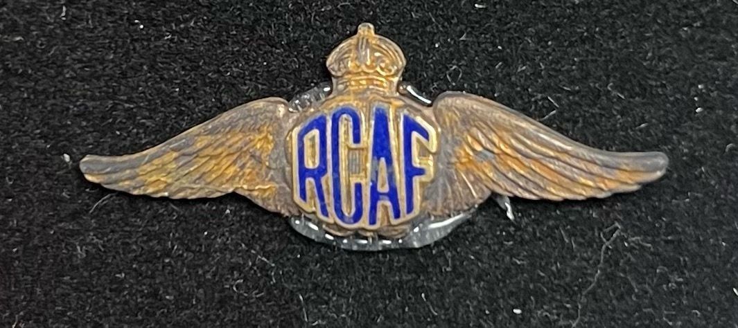 Gold wings with the King's crown overhead blue lettered RCAF.Context
