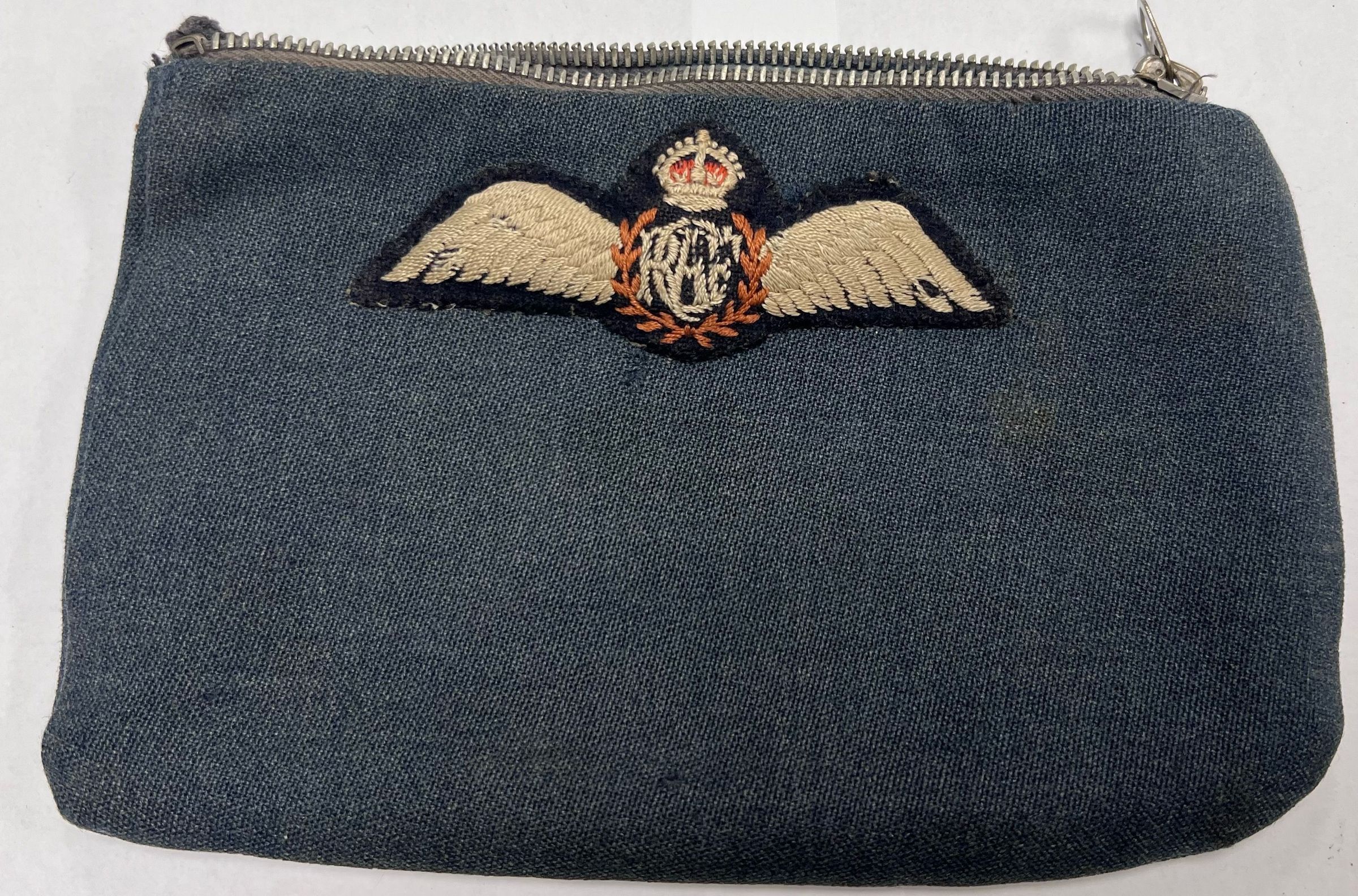 A blue pouch with a zipper with a pair of RCAF badges.Context